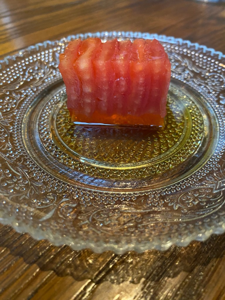 Como ha acabado con cualquier artificio, se pasa directamente a la mesa y todo será sorpresa porque ha desdibujado todas las fronteras entre entradas y principales, dulces y salados… Es de lo único que me quejé -como contaré-, me lo explicó y me convenció. Empieza el menú con un arquitectónico tomate con aceite de oliva, montado sobre una base de gelatina, y que parece saber más que cualquier tomate. Está curado en sal y azúcar y la gelatina es de agua del propio tomate y aporta fuerza, elegancia y otro rojo. Como si fueran muchos tomates en uno.