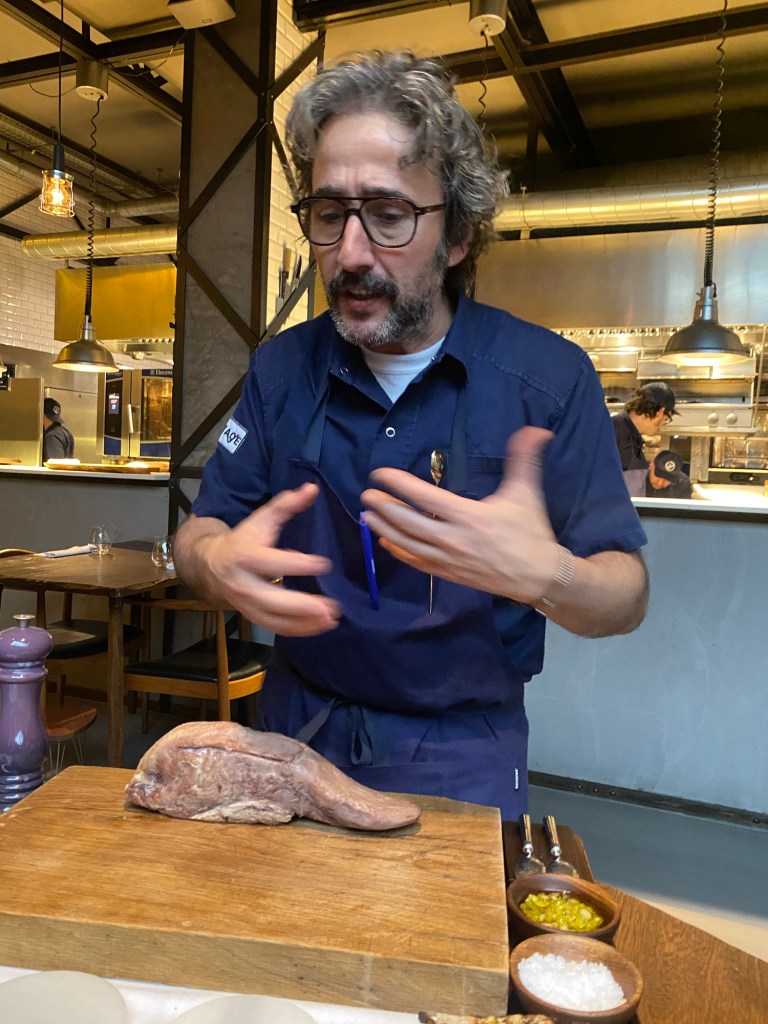 Aparece ante el cliente con una lengua entera, es bastante arriesgado, al menos hasta que se prueba el delicioso pseudo paté que se hace con ella, y digo pseudo por que, en realidad, es una crema muy suave, que se produce naturalmente después de tener la lengua en aceite y sal cuarenta y ocho horas. Bastan un poco de sal y pimienta, alcaparrones y piparras, para completar esta sorprendente delicia. Después, basta untarla sobre un perfecto pan de masa madre de pasas y nueces, porque ahora también hacen panes y…vaya panes.