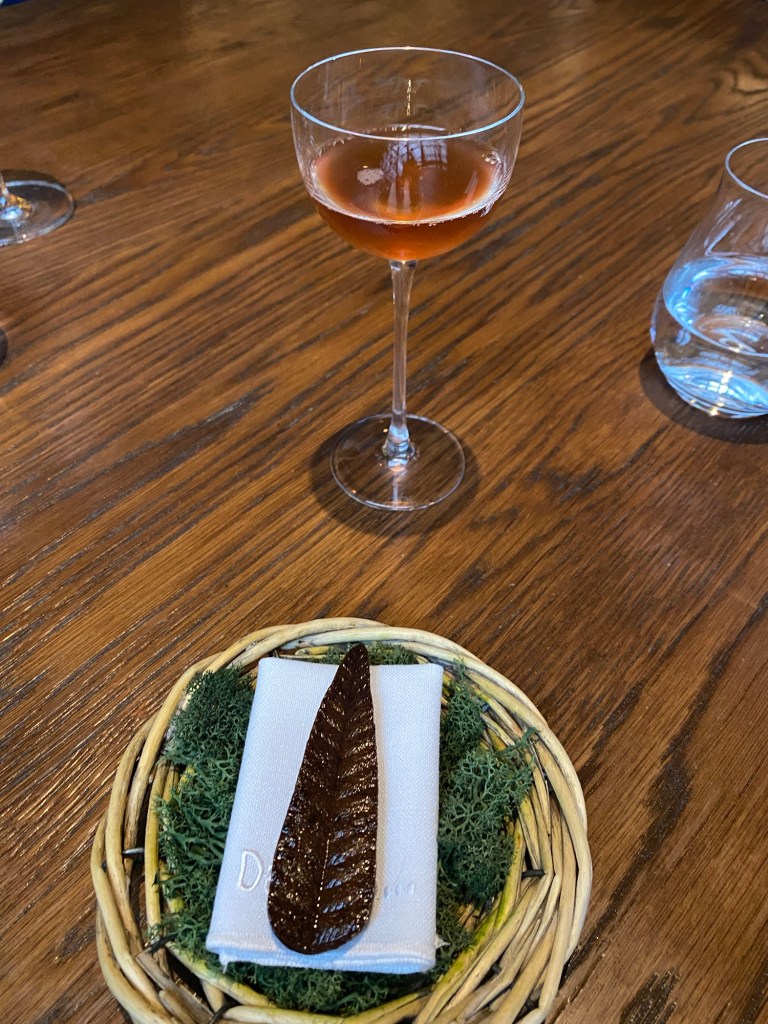 Y por fin, la caza, la otra gran pata de esta cocina de la tierra, sofisticada con mucha inteligencia y conocimiento. Es tendón de ciervo con vermu e hinojo, un enunciado que no me ha gustado nada pero resulta que está rico porque los tendones están muy tiernos, gracias a un estofado lento, y suavizados por la emulsión de hinojo. Tiene unos ricos noodlesde vermú y también galleta de flor de saúco. No es lo que más me entusiasma pero es un buen plato.