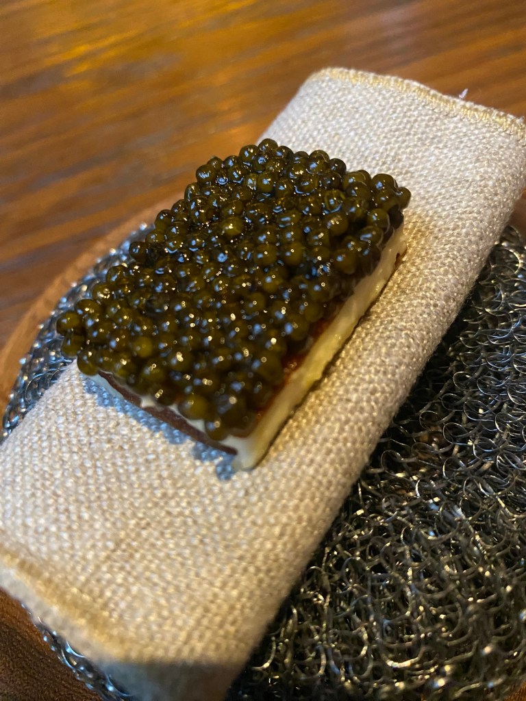 Empiezo a cansarme de la banalización que algunos usan el caviar como si fuera sal y por eso necesito cocina a su lado, que para comerlo con blinis ya lo hago en casa más barato. Ponerlo con una galleta de calabaza, extrafina y a modo de sándwich, rellena de mantequilla tostada es mejorarlo hasta límites insospechados porque el simple bocadillo ya es de por sí impresionante.