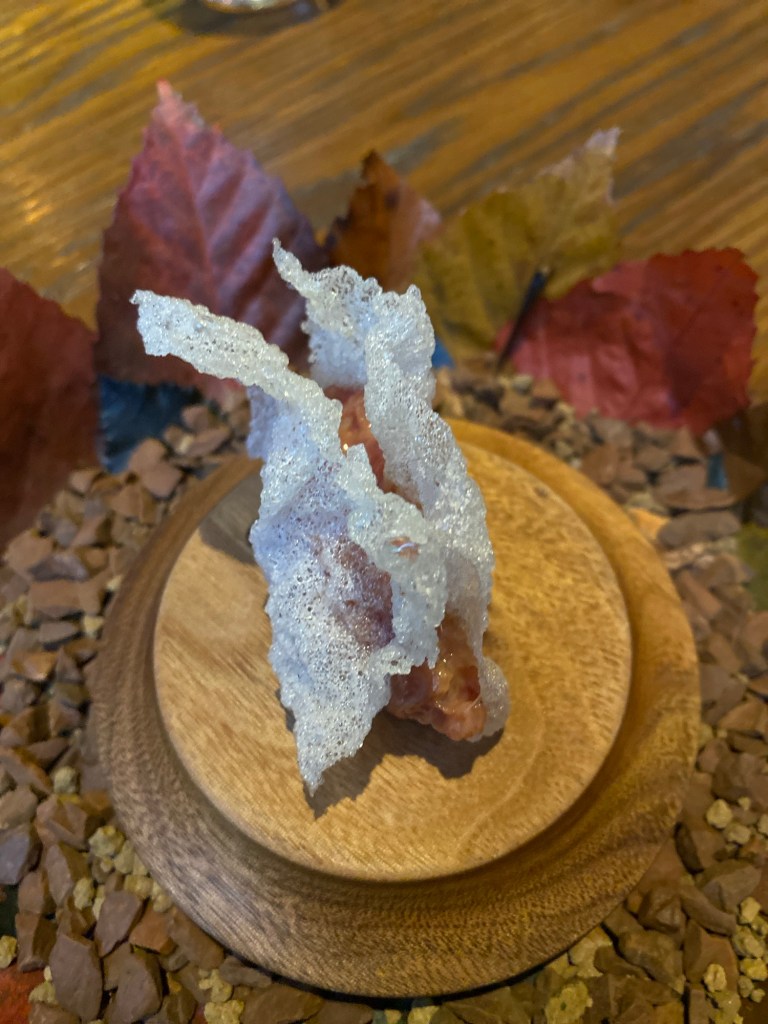 Pero hay más vegetales porque la huerta manchega de secano, nada tiene que envidiar a la de Almería o a la de Murcia, tal como nos cuenta un orgulloso chef. Ahora tenemos zanahorias de colores con sabroso ajo negro y espinacas. La zanahoria está encurtida y también en emulsión, escabeche de ajo negro con unos buenos toques amargos que contrastan con el dulzor de la zanahoria. Para alternar, un canutillo de pieles y restos de la zanahoria, relleno de crema de pomelo. Un plato lleno de contrastes y texturas, muy bonito, pero en el que resaltan demasiado amargos muy fuertes.