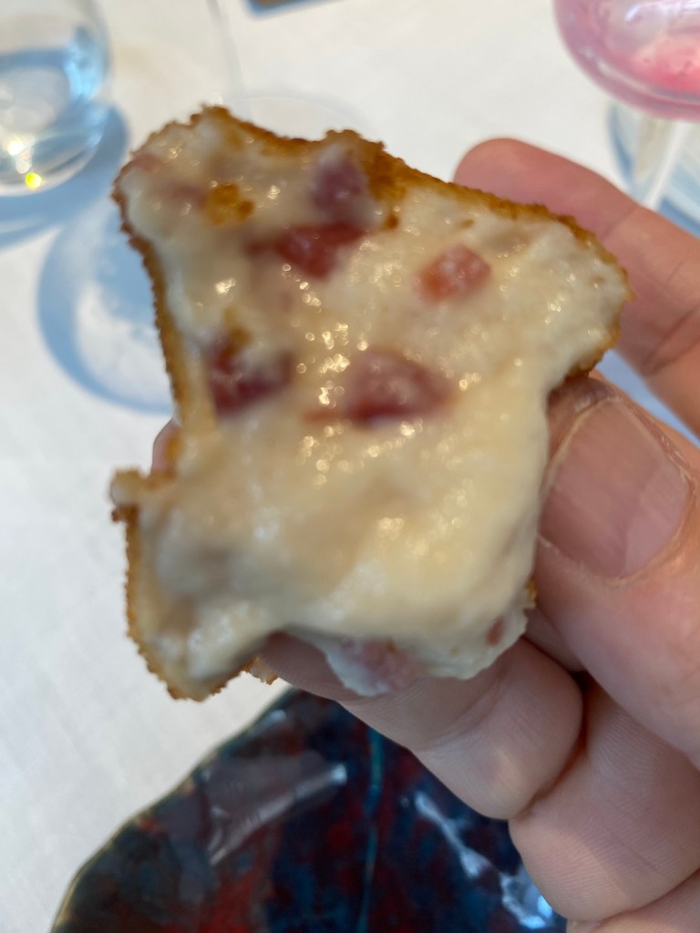 Los aperitivos bajan la intensidad, ganando en delicadeza: gambas blancas de Tarragona con crema de raiford y aceite de perifollo, con el toque delicioso de la creme fraiche, tartar de jurela, qué es más sutil que el jurel, con los sabores punzantes de los encurtidos, tierno brioche frito relleno de guiso de chocos encebollados, con una espléndida holandesa de su tinta, y una soberbia croqueta de merluza en la que usan el cogote y en vez de harina el colágeno; espectacular y semilíquida.