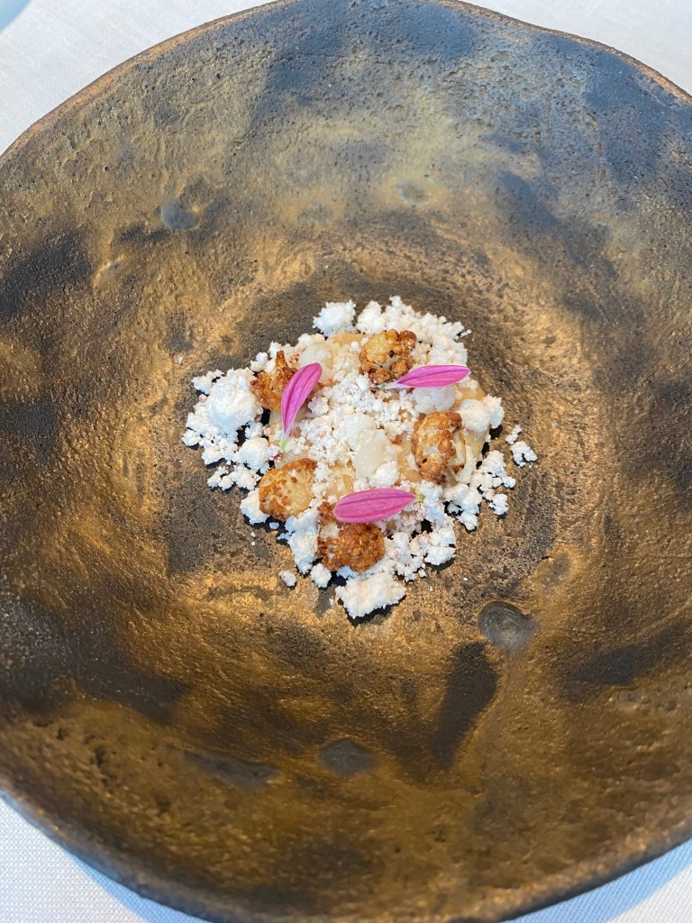 Muy buena una coliflor (frita y encurtida) conmantequilla noisette de grasa de jamón rancia, un homenaje a la cocina popular manchega basada en las hortalizas y el cerdo.