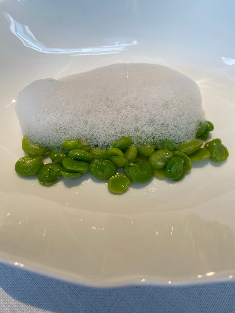 En campo de secano no podían faltar las habas tiernas, aquí animadas con colágeno de bacalao y un estupendo aire de anís. También hay callos con un pilpil delicioso y gracias al corte y a la cocción estás mucho más blandos y más suaves de lo habitual. Deliciosos.