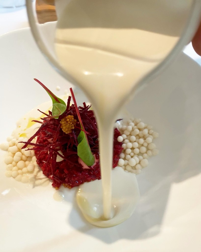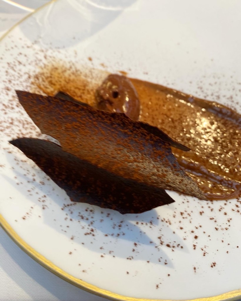 Acabamos lo salado -a punto del colapso (mayormente de placer)- con el canelón de seda (que es una masa líquida de almidón de arroz) relleno de una especiada pintada en estofado pibil, con una enjundiosa salsa de los jugos de la pintada, una etérea bechamel aireada y la rica y picosa salsa verde mejicana. Otra sinfonía en la que reina el magisterio sobre muchas cocinas y el talento para mezclarlas todas, mejorando los originales.