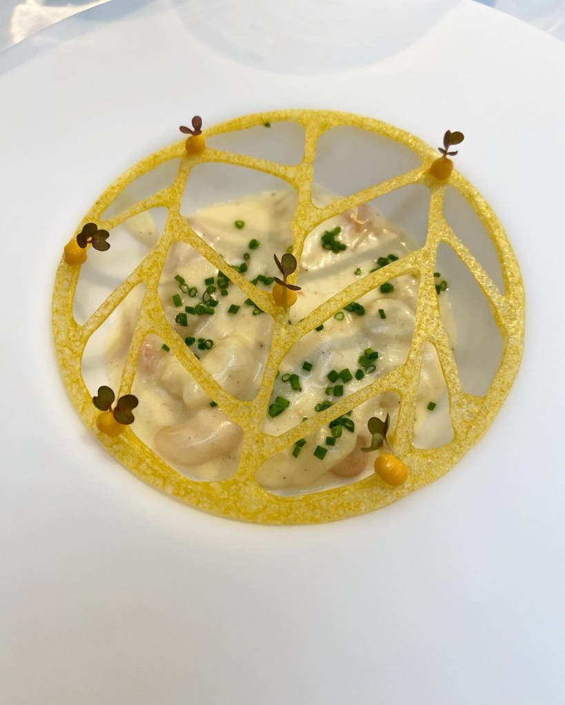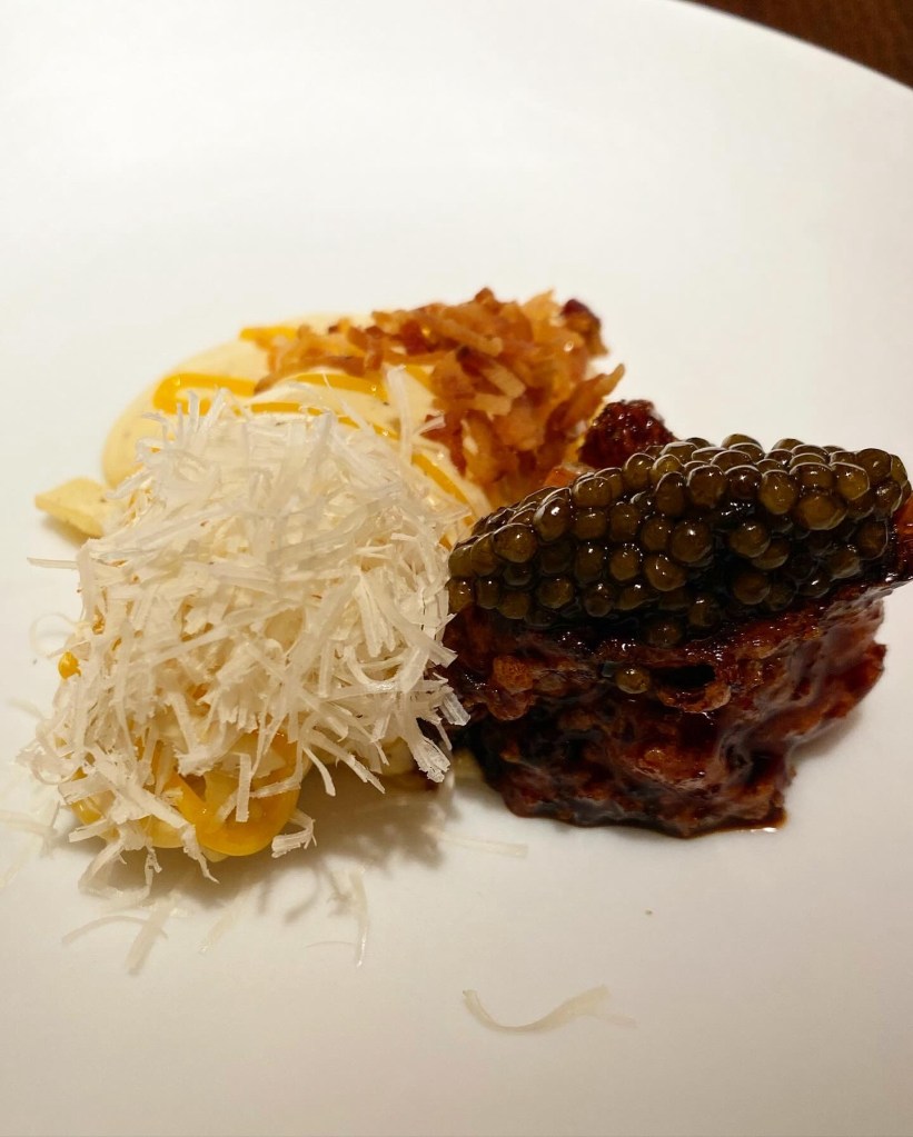 Las mejoras comienzan con un provocador “clásico” como es la pasta de la resaca, porque es toda una sorpresa que una pasta fría embelese. Sus toques picantes están aún mejores y el de caviar sobre un crujientísino pollo es soberbio. El resto lo hacen los muchos sabores (pecorino, guanciale, albahaca thau, yuzu, yema de huevo curada…) y el perfecto punto de la suculenta pasta.