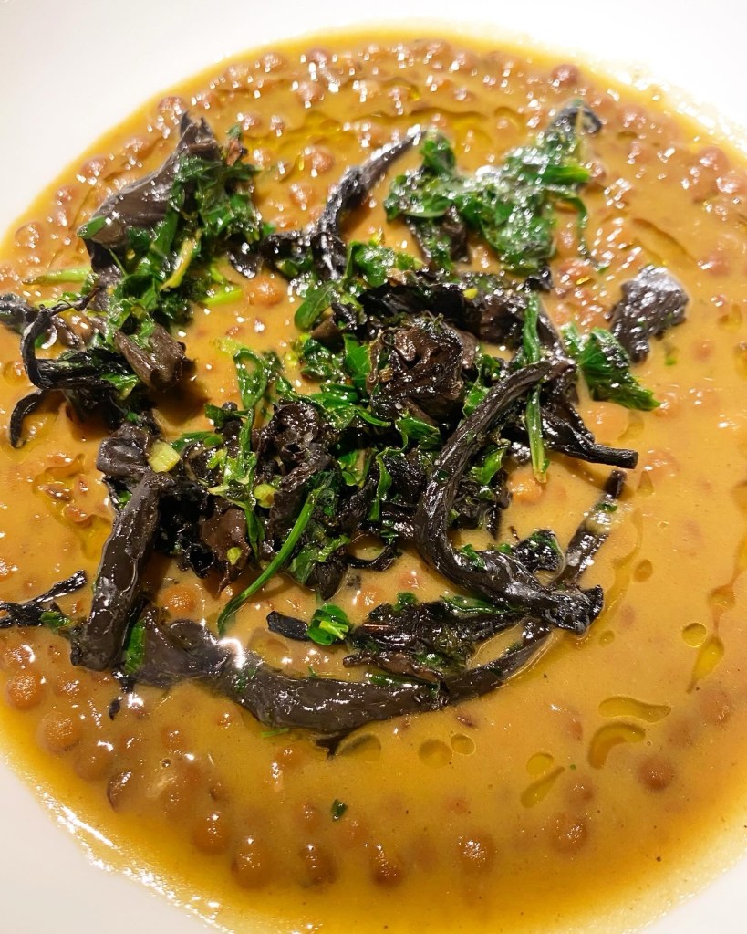 La sopa wontolini es tan vivificante -con su intenso caldo de gallina agripicante, de textura densa de gel y transparencia única, y sus suaves tortellini de mortadela– como delicada, y ello sucede por sus flores de aliso y los pequeños tropezones de shitake.