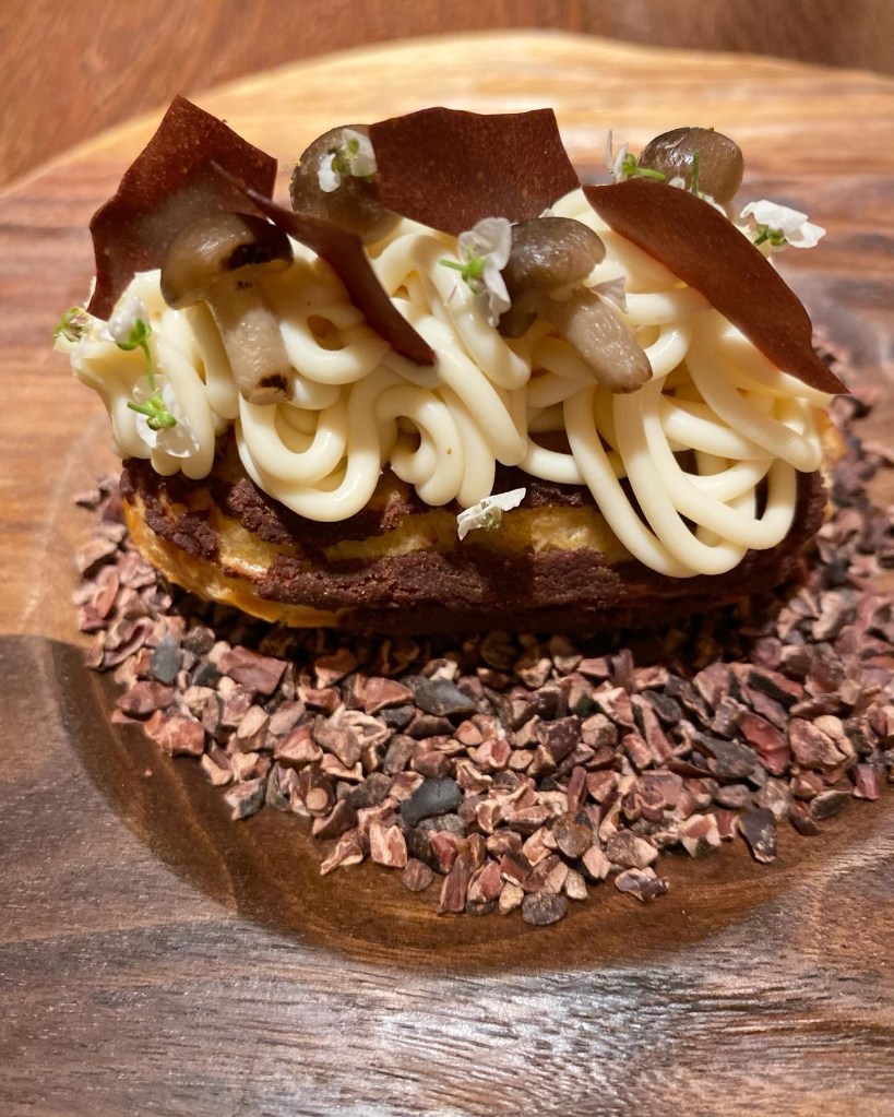 Nos han traído la sorpresa de un nuevo eclaire de caramelo con cinco especias japonesas, namelaka (muy cremoso en japonés), shitakes y shimejis, mantequilla crujiente y chocolate. Cremoso y muy envolvente, llena el paladar, y no desdeña el sabor de las setas que, sin abusar, le dan un toque completamente diferente y delicioso.