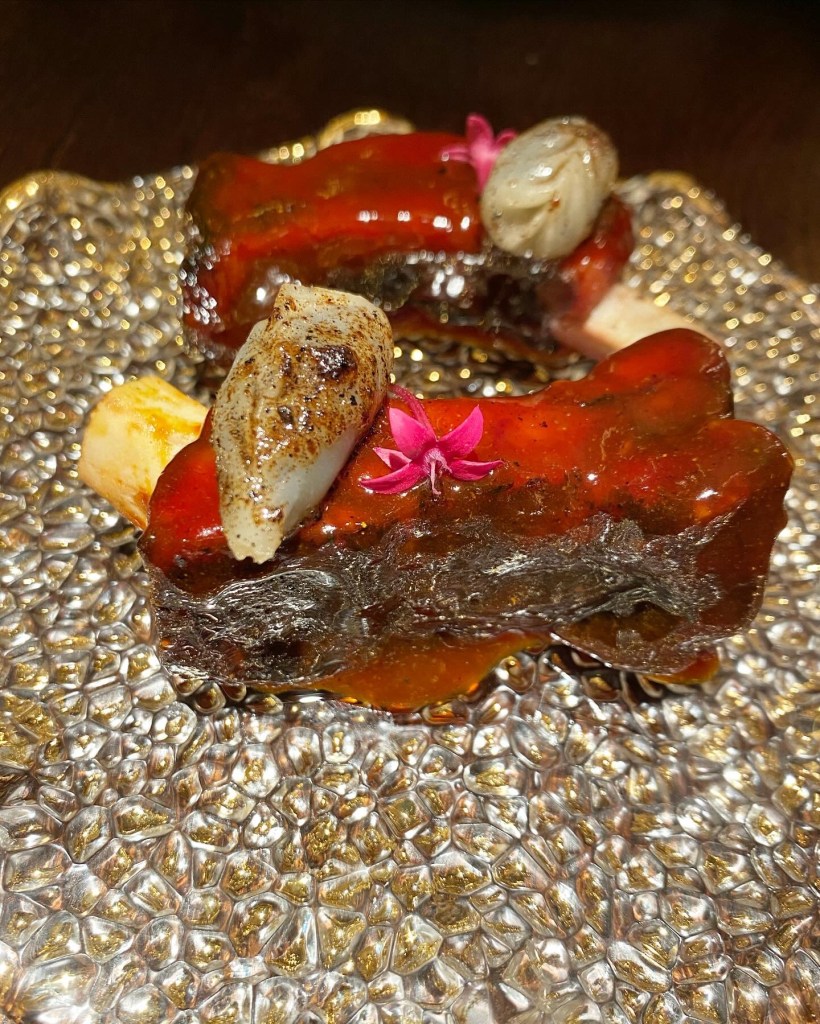 La riqueza se llama carabinero a la brasa y el lujo se condensa en este plato sinoitaliano que lleva también tagliatelle al wok y tostado, de crujiente textura, seta oreja de madera y salsas de chili garlic y guindilla. Otro de mis imprescindibles (y… ¿cuál no lo es?)
