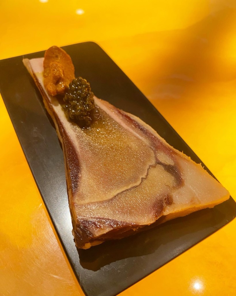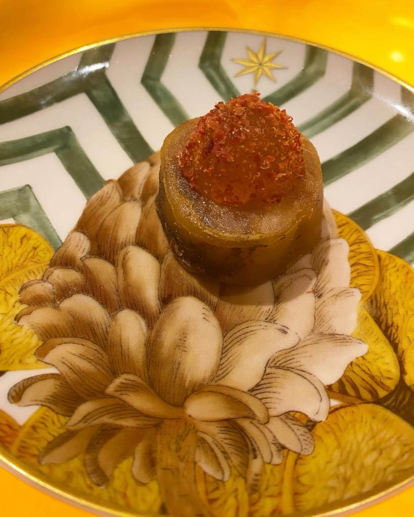 Y del bar al salón de los ónices, presidido por una monumental y alta mesa de amarillo ónix. Aquí españolismo puro de Cinco Jotas con un gran gelatina de jamón que nada más necesita y una mezcla tan loca como sublime: caviar y erizo con salsa de callos (un lejano invento de Mario que debería patentar) sobre tuétano de jamón. Impresionante.