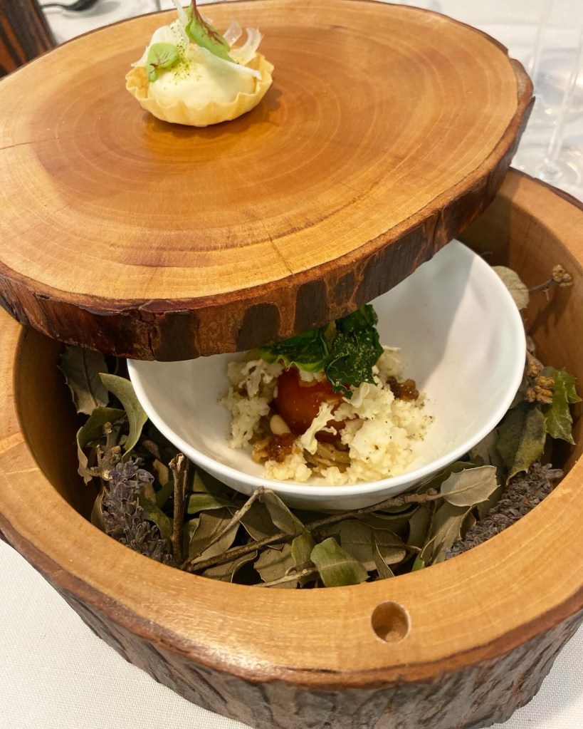 En un trozo de tronco (el rusticismo) llega una tarta muy fina de nuez y miel rellena de crema espumosa de coliflor y escondida en el interior una mezcla compleja y fastuosa: yema curada con ponzu que, una vez rota, es una aterciopelada salsa para un rico guiso de berenjenas con papada, piñones y perlas de Jerez.