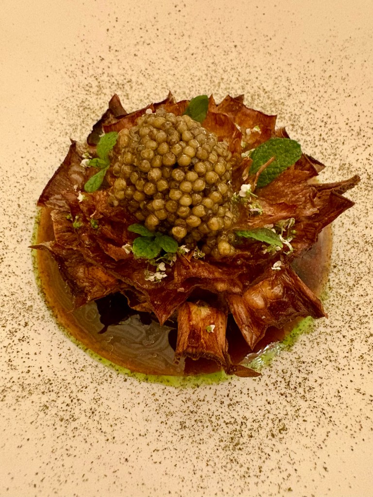 Las raíces se articulan en torno al mosto y eso se traduce en aún mejores complementos: un sabroso bocadito de semimojama y queso viejo, bombón de hígados y foie, una fina tartaleta de chicharrón de Cádiz con caviar (que no se merece menos) y el dos en uno del boquerón en vinagre con caldo, ácido y especiado, de zanahorias “encominas”.