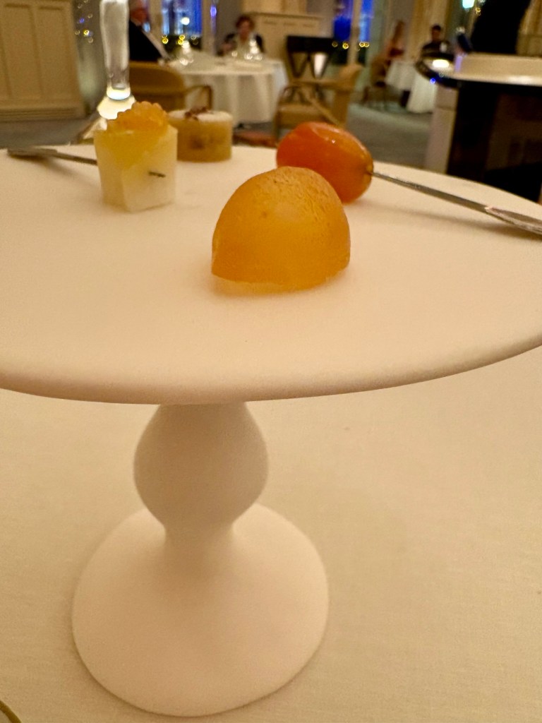 Quizá el listón estaba muy alto, quizá es de los pocos chefs que dominan la pastelería pero, esta vez, los postres me han decepcionado algo porque los tres eran muy parecidos, extraordinarios todos, pero helados siempre: cítricos con maravillosa crema de kefir casero y aceite, envolvente queso con gran agua de dátil y la conocida y soberbia versión del Montblanc de esta casa.