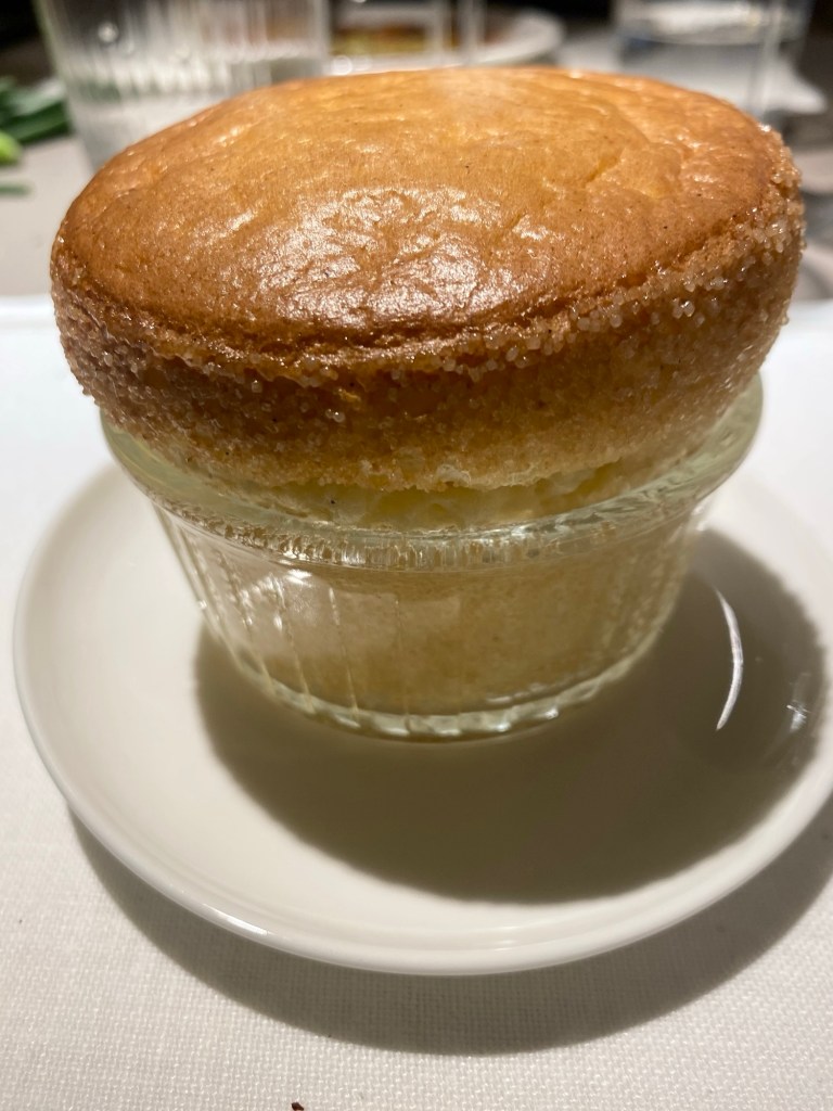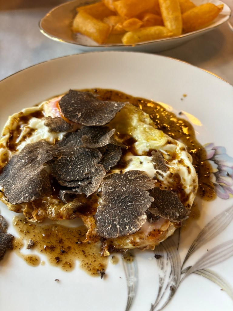 Los huevos fritos con trufa y patatas suflé son sencillos y elegantes a la vez, pero están entre los mejores que he comido, merced a la estupenda salsa Perigord y a las doradas y perfectas patatas.
