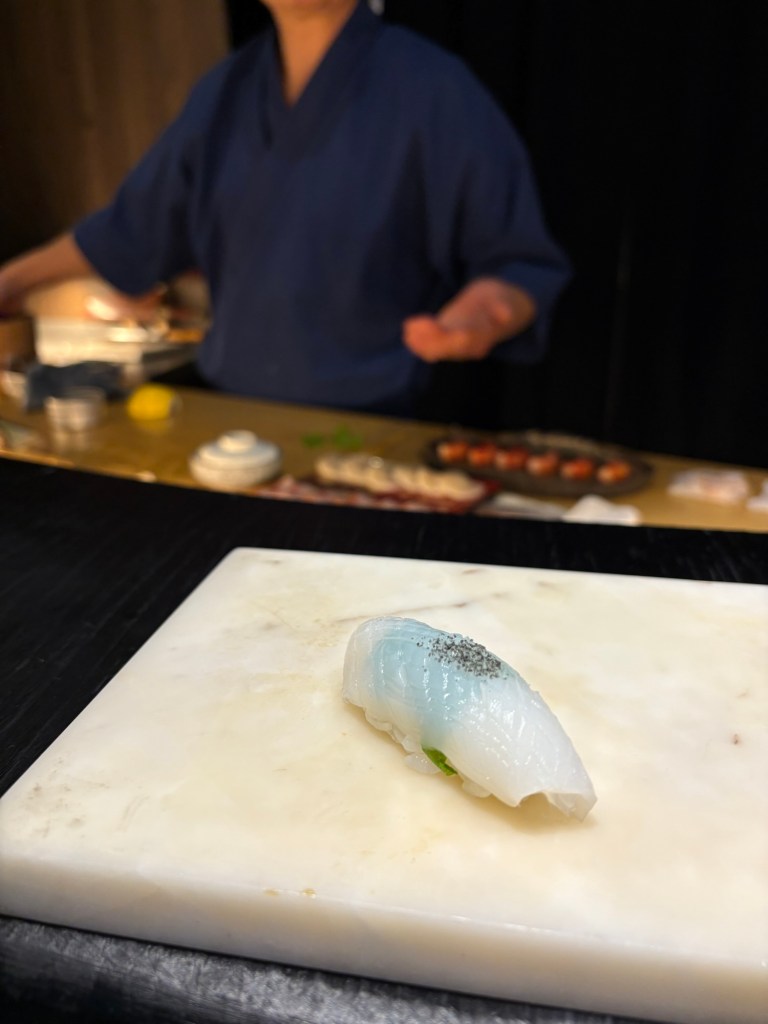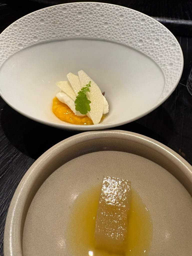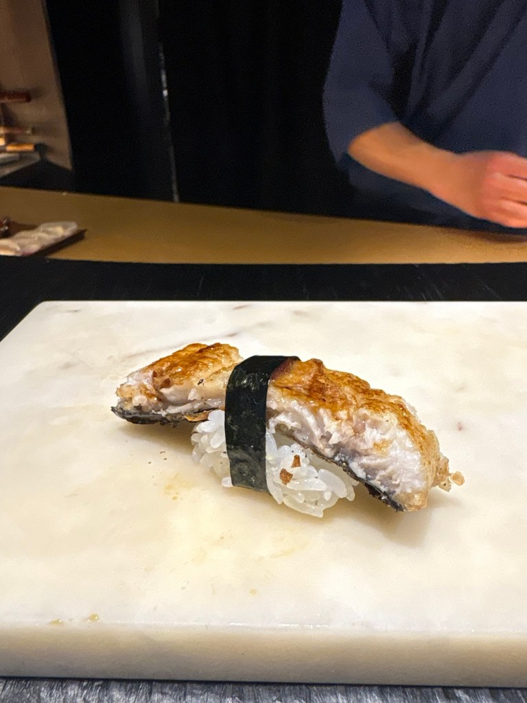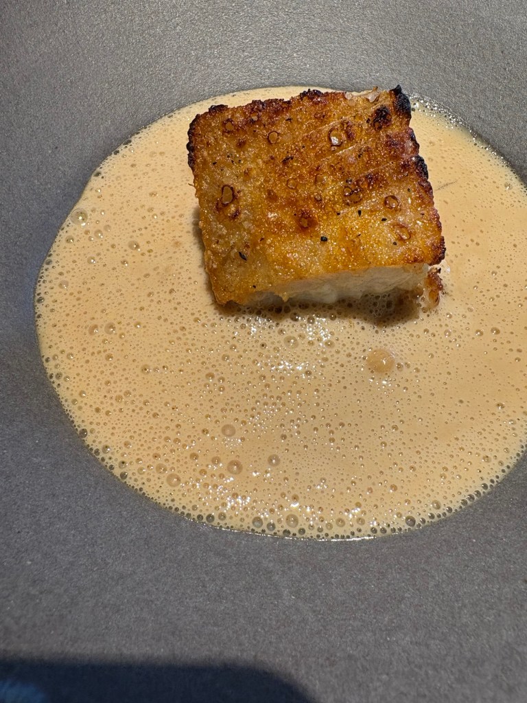El mero tiene una piel tan crujiente como nunca (la llaman torrezno marino) y se debe a una técnica de desescamado llamada sukibiki. La carne, madurada una semana, está muy jugosa y se moja en una salsa espumosa del pescado con almendras ahumadas. Súper receta.