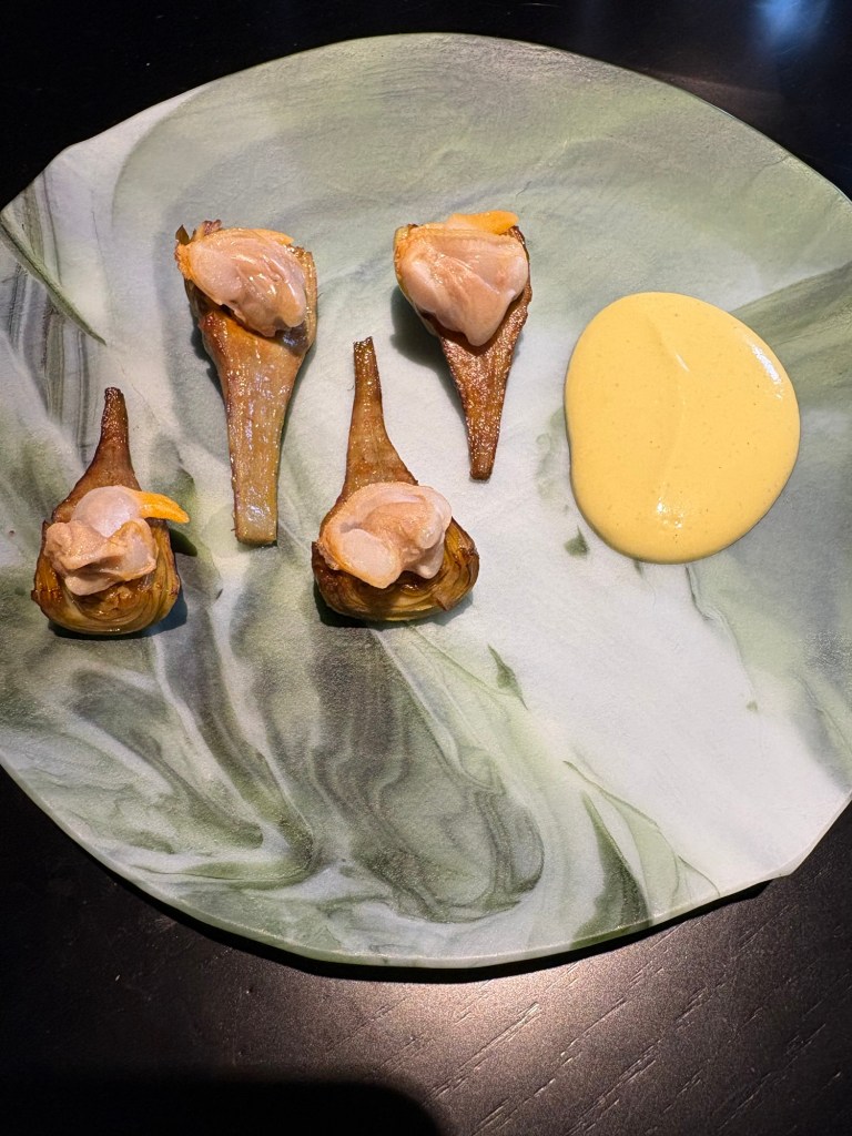 Las pequeñas alcachofas a la brasa de sarmiento con un simple -pero extraordinario- berberecho son impresionantes, pero aún lo es más una soberbia y elegante emulsión de vino blanco y caldo de berberechos. Y como las alcachofas son reto de grandes sumilleres, Ismael Álvarez, que lo es y mucho, las sirve con Contubernio, un excelente medium sanluqueño con el dulzor justo.