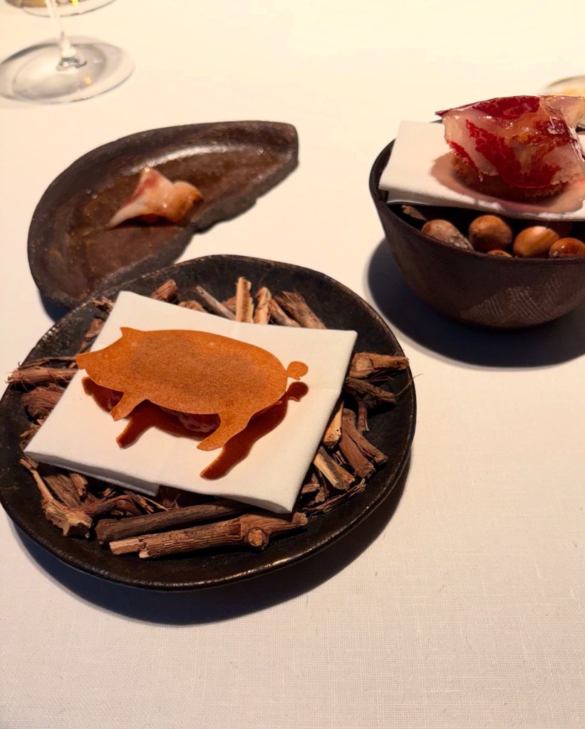 Al llegar a la mesa también hay un producto rey, como antes la trufa o la anchoa, y ahora le toca al cerdo, pero no a cualquiera sino al mejor del mundo, el de Joselito: un cerdito de patata crujiente con steak tartare y queso de oveja, su multipremiada y magnífica croqueta de jamón con una loncha de copa y leche fresca de oveja y un rico chicharrón al limón.