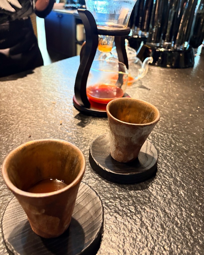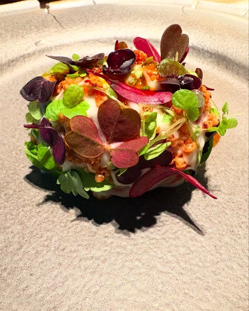 En la mesa, una copa de excelso Krug con una galleta que es una bella flor prensada, como en libro antiguo, con queso y un increíble kebab hecho milhojas. Se toma con infusión de hierbas e hibiscus y precede a la sabrosa croqueta voladora que es un juego encantador que parece prestidigitación porque el platillo vuela en un gran juego de imanes.