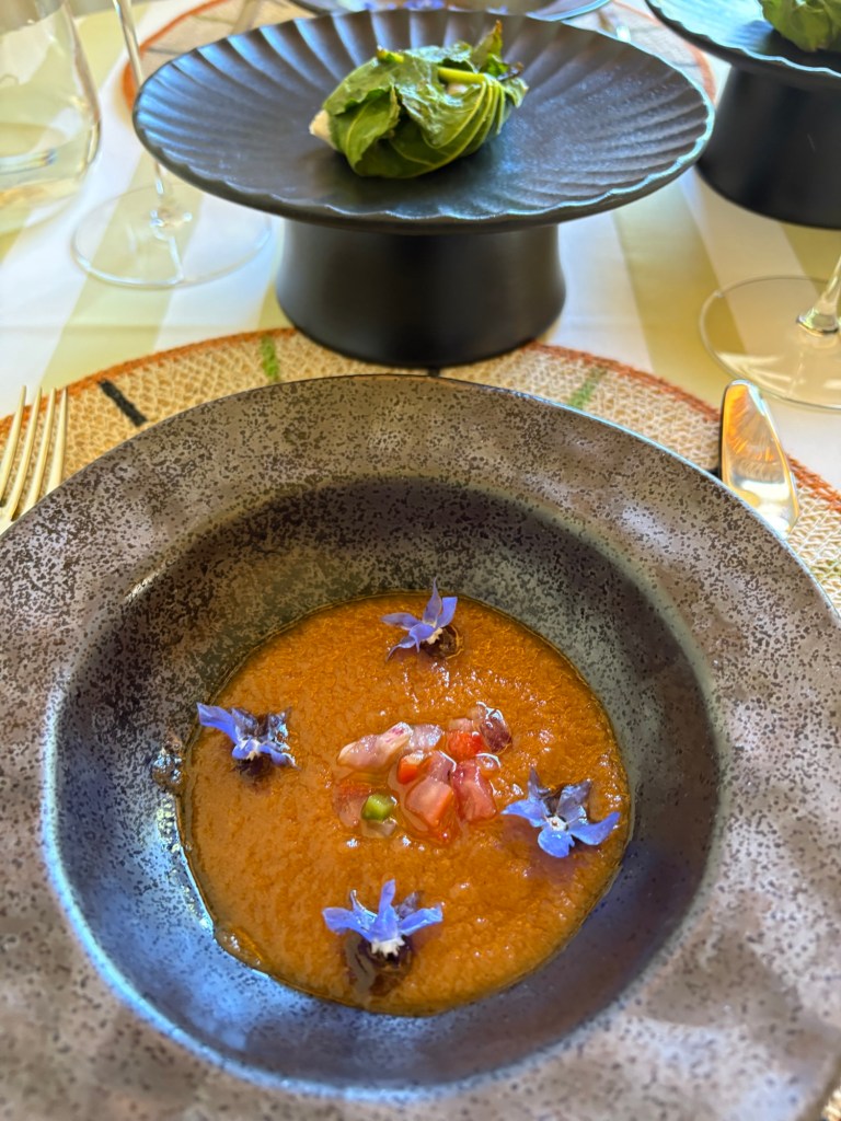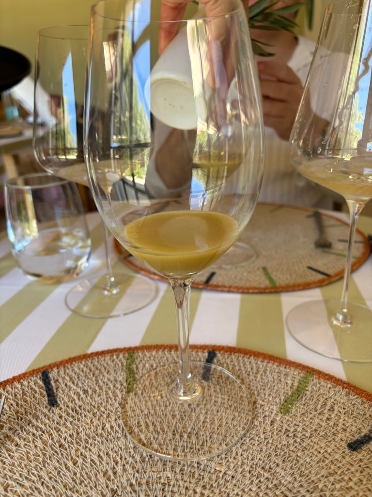 Por eso empieza con una riquísima crema de aceitunas de la finca servida en una copa demasiado grande y poco adecuada para ella.