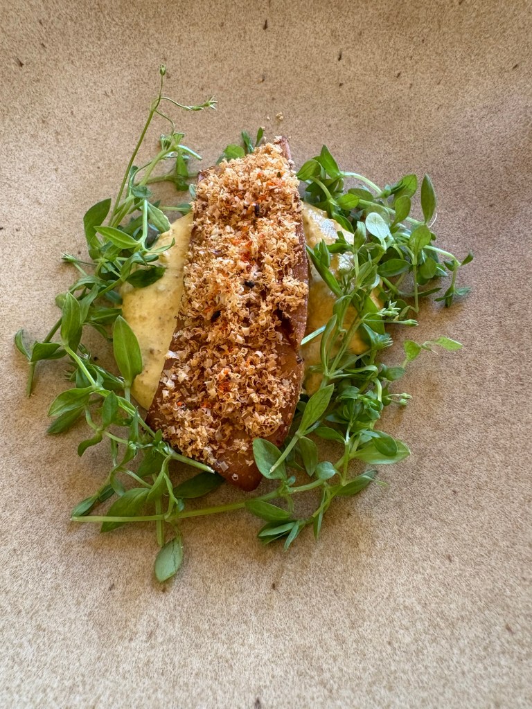 Hay que tener mucho talento para hacer con un poco de maíz uno de los mejores platos del menú. Ilusión perfecta porque parece una mazorca, pero el interior es delicada y sabrosa crema de maíz y garbanzos. La salsa de maíz tostado picante le da un toque excelente, como los puntos de algarroba y garbanzos tostados. Remata un gran helado de maíz y ajo tostado.