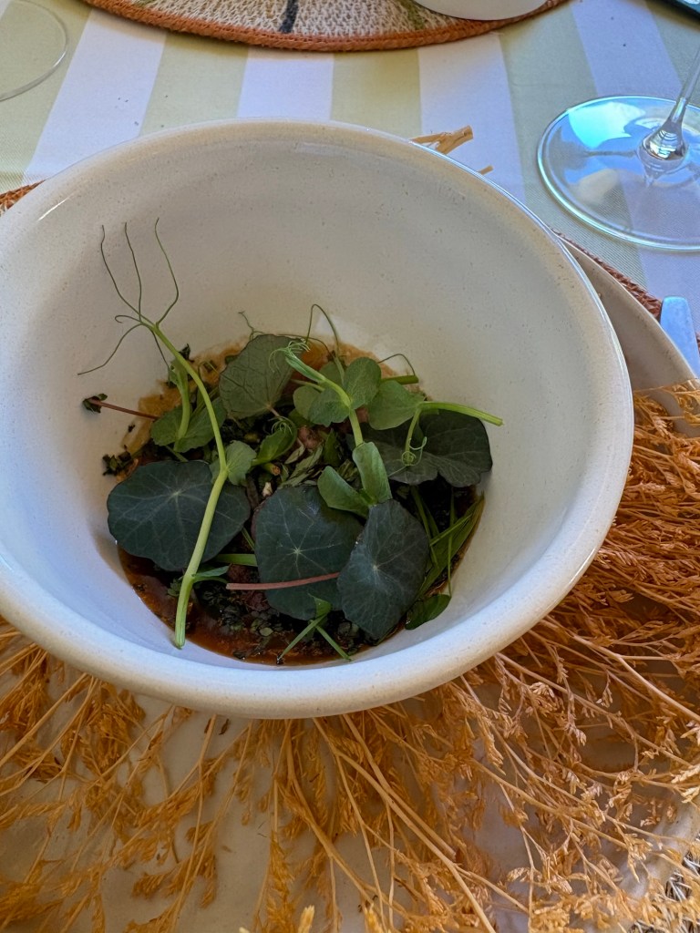 Pero lo cierto, es que el lugar está ya bastante engrasado, sobre todo su cocina colorista, imaginativa y vistosa para la que usa técnicas variadas y estéticas no siempre acertadas. Claro que a mí no me gusta esta, tan de moda, en la que todo parece comida de cabras, tanto se abusa de las ramas, las hierbas y la rusticidad, en un falsísimo retorno al origen. Pero estamos en el Amagatay, un hotel hippy chic y es lo que predican.