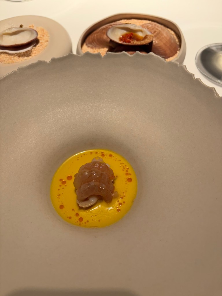 Una delicia. Los calamares se hacen tallarines congelándolos y rompiéndoles las fibras. Los suavizan con una base de yemas y los llenan de sabor con una densa salsa de rancio ibérico. Otra gran mezcla llena de ideas y buena cocina que aún se complementa con un no muy bonito -pero muy rico- velo de calamar pintado con tinta y grasa de jamón.