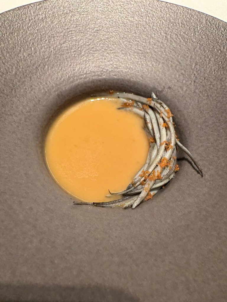 Empieza sin concesiones -aunque parece que es el plato favorito de la gente- y sigue por ese camino con otro bello experimento que coloca sobre un precioso y delicado mantel, que parece un gyotaku (si no fuera porque es en plástico) con un koi, la carpa japonesa que representa entre otras cosas, el amor y la buena suerte. Sirve de base a una carbonara sin guancialle y con anguila y en la que la pasta es gnochi de arroz glutinoso que, a mi que odio las gominolas y similares, no me gusta absolutamente nada, por su rigidez plástica. Lo demás es excelente, sobre todo la espuma de queso y remolacha y el helado de queso con caviar. Creo que no me hará caso pero sin lo gomoso, sería perfecto. Se toma con un gran rosado (cómo no) y les pongo muchos de los vinos porque la armonía es perfecta, gracias a ese alter ego de Alejandro, que es el magnífico sumiller y jefe de sala.