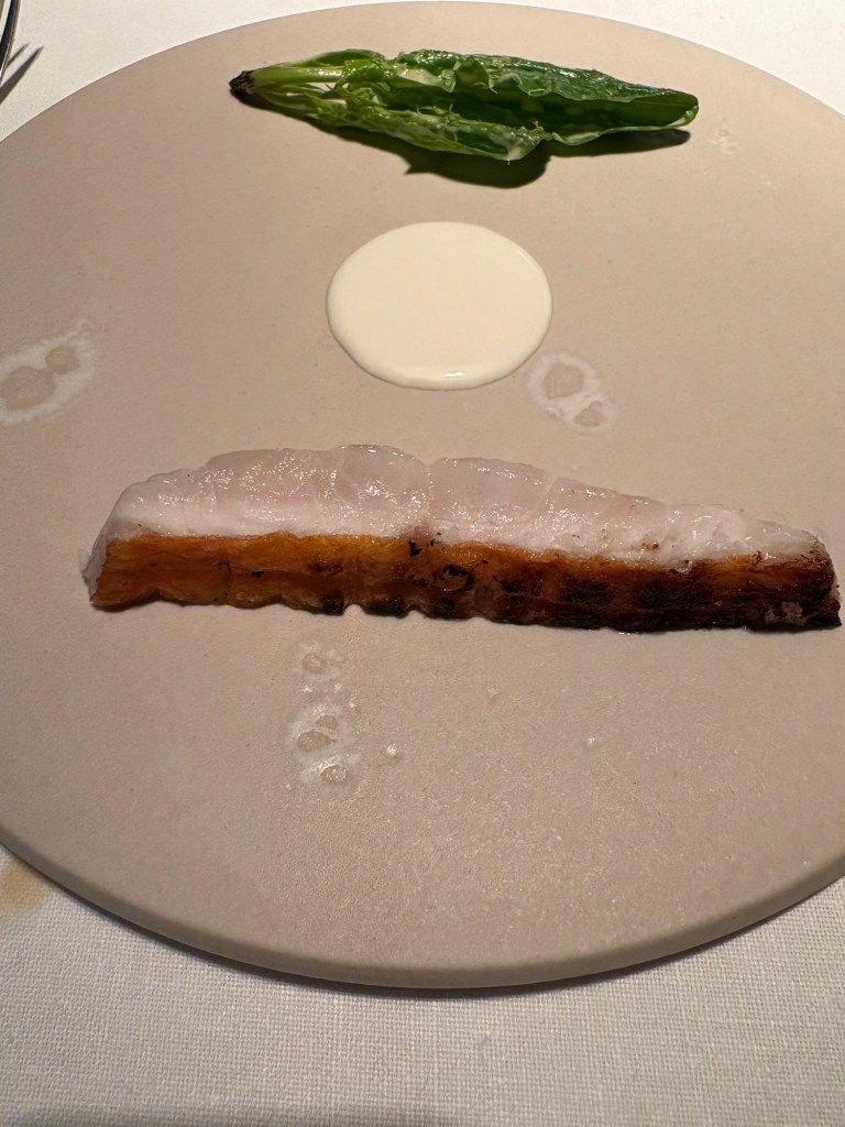 Los panes, seis (de las semillas al judío pasando por la torta árabe o las aceitunas y la algarroba), son de gran calidad y acompañan a una delicada baba ganush con escabeche de aceitunas y pétalos de pimientos choriceros. A modo de pintura rupestre, una frágil galleta con anchoas que es puro sabor salino. Con un sublime Domaine Le Flaive, se llega a la perfección.