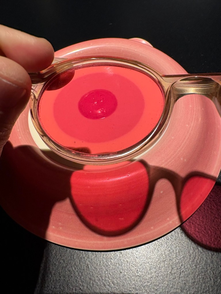Para pasar a la mesa nos pone unas gafas rosas, como si su ensaladilla no fuera suficientemente rosada. El plato es el del recuerdo infantil, pero estéticamente está entre los círculos concéntricos de Sonia Delaunay y las píldoras de Hirst. Pero lo mejor es que la hace líquida y engaña a la perfección. En el paladar, todo es ensaladilla rusa con fuerte sabor a atún y mahonesa.