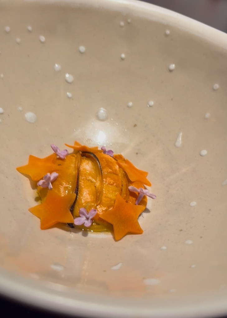 El camarón se viste con zanahorias encurtidas y en escabeche de muchos ácidos. Los corales de una concha fina con algo de camarón y el contraste estupendo y delicioso del consomé de pollo.