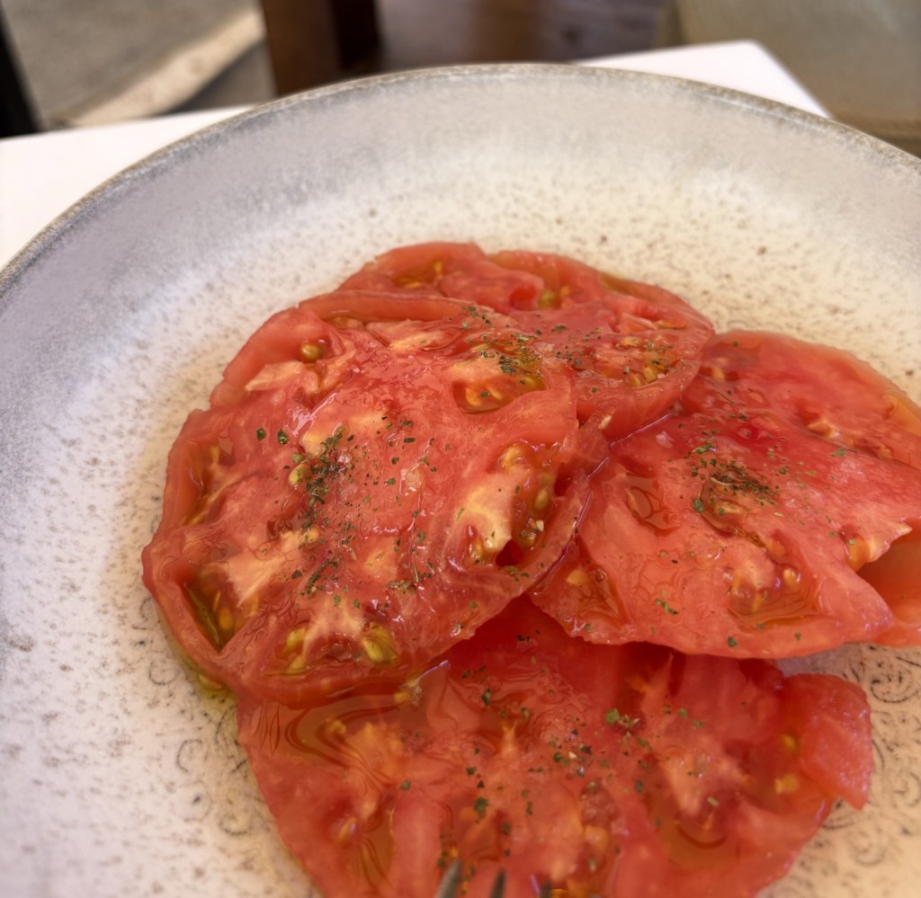 Sigue el sabor, pero vuelve la estética sin prejuicios con un dulce tomate con hierbas aromáticas del huerto, queso rallado, un garum de anchoas reinventado y un toque de miel.