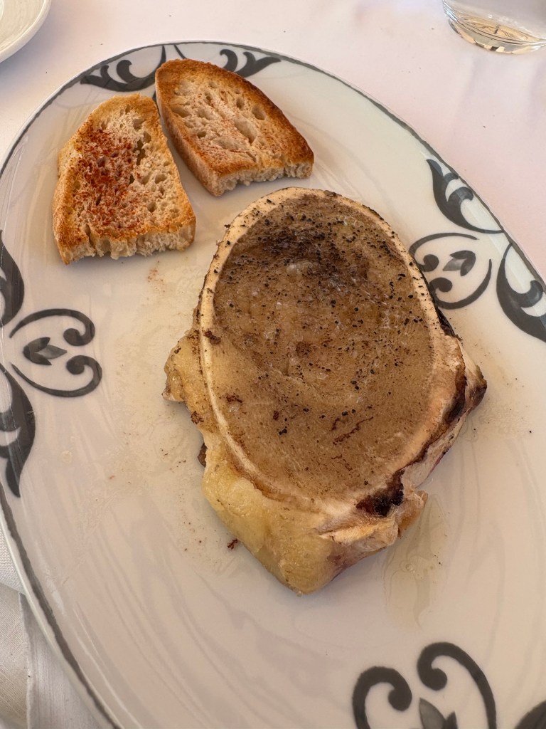 Unas estupendas chacinas, también de buey ,preceden al tuétano, tan grande que no se corta a lo largo sino en rodajas. Sazonado con mantequilla, pimienta, jalapeños y cítricos no puede estar mejor.