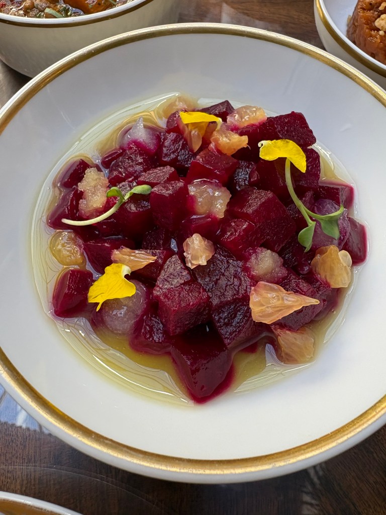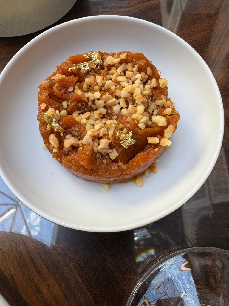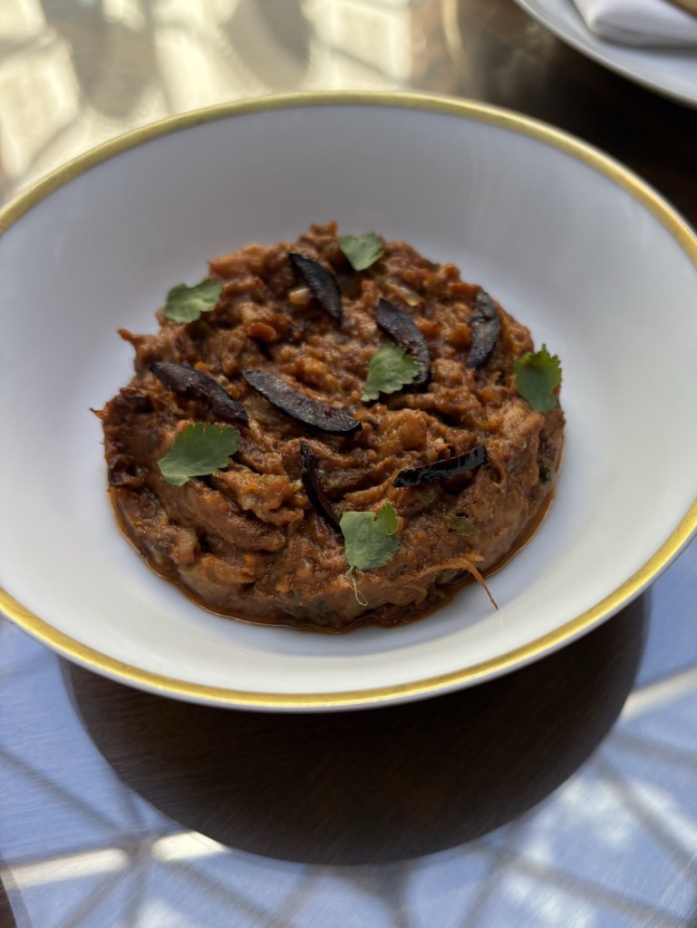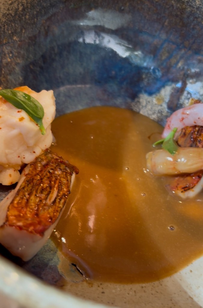De esos platos toscos que hablaba, no me gusta la açorda (más o menos puré de pan mojado) hasta que la coge un gran cocinero y la mima, la aliña muy bien y la hace crema. Es base del jugo de la cabeza y del cuerpo de un delicioso carabinerodel Algarve cocinado como lo hacían en Goa, con ácidos y picantes, además de frescor de acelgas y una “pimienta” de las cáscaras deshidratas. Un enorme plato.