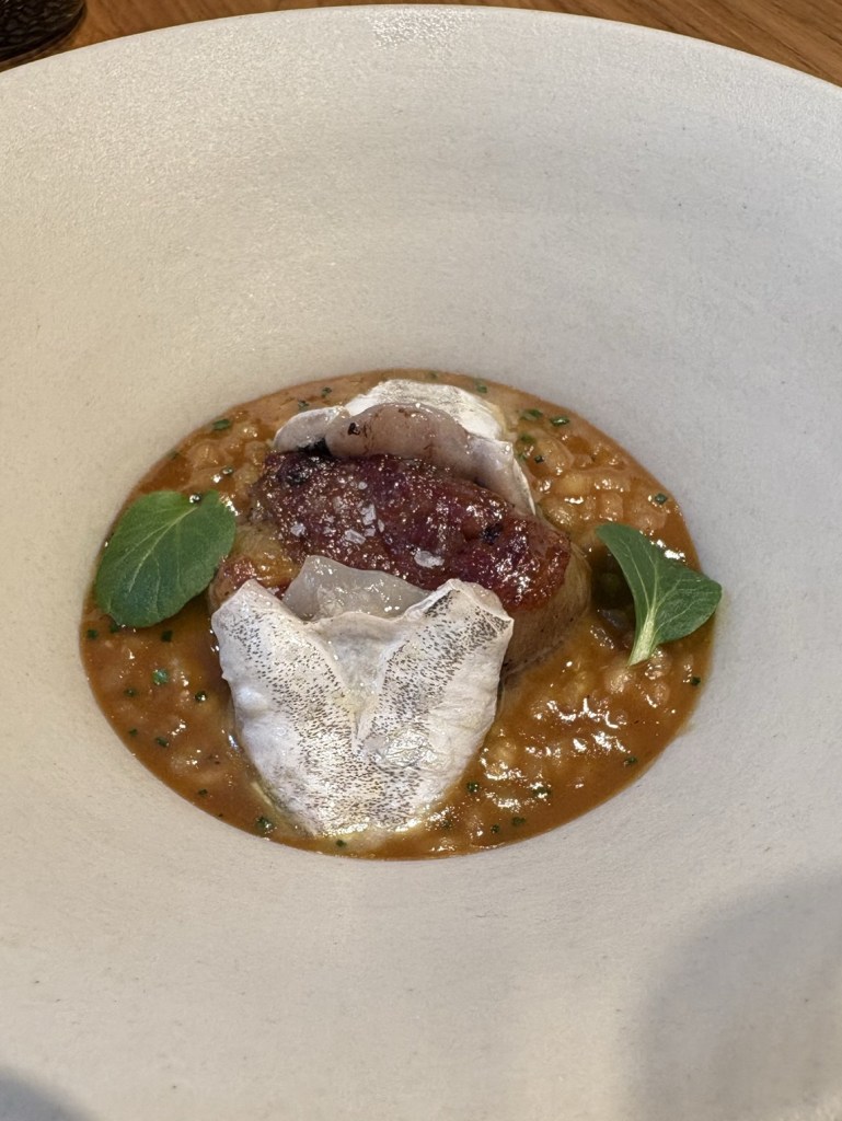 Los panes de masa madre y esponjoso brioche son magníficos, pero aún más lo es una mantequilla envejecida y ahumada con un poco de aceite de menta. Los sirven como un verdadero plato y dan paso a un estupendo mero con caviar, mantequilla tostada de algas y una perfecta salsa de caldeirada que tiene en su sabor todo el alma del guiso. Por eso, los puntos de pimiento me han resultado algo superfluos.