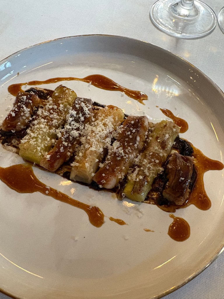 Me ha encantado el plato de los puerros, confitados y asados, con anguila ahumada. Glaseada esta con jugo de carne y todo rociado con avellana rallada, es una entrada deliciosa y elegante.