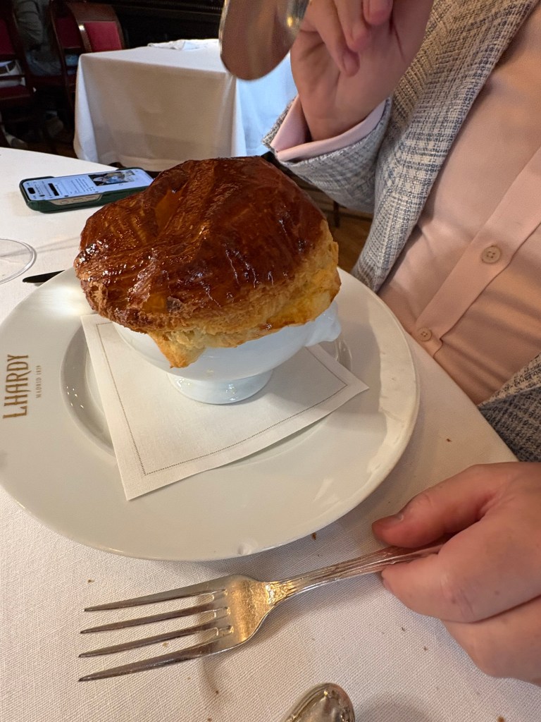 También muy elegante y muy potente, una sopa de cebolla canónica, pero que tiene la gracia de estar coronada con una cúpula de crujiente hojaldre al estilo de la sopa V.G.E. de Bocusse.