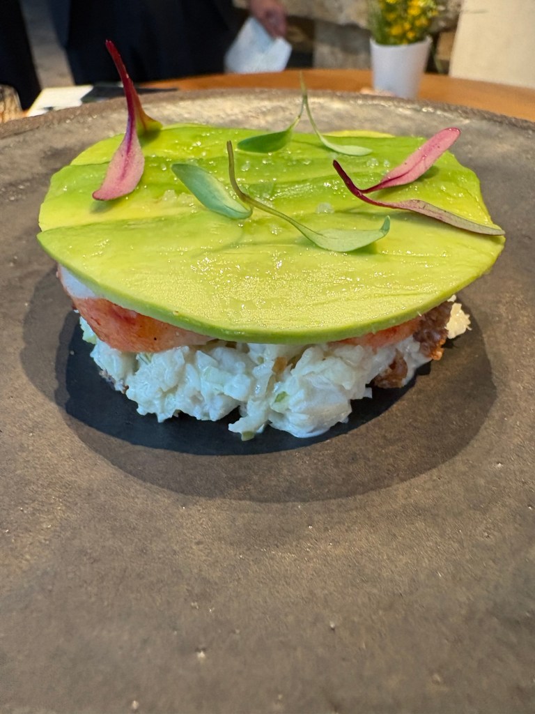 El cangrejo real de Noruega se muestra vivo cuando presentan los manjares del día. Para no alterar su delicado sabor lo hacen ensalada Waldorf, con la justa cantidad de manzana, nueces y mostaza, y la untuosidad vegetal del aguacate.