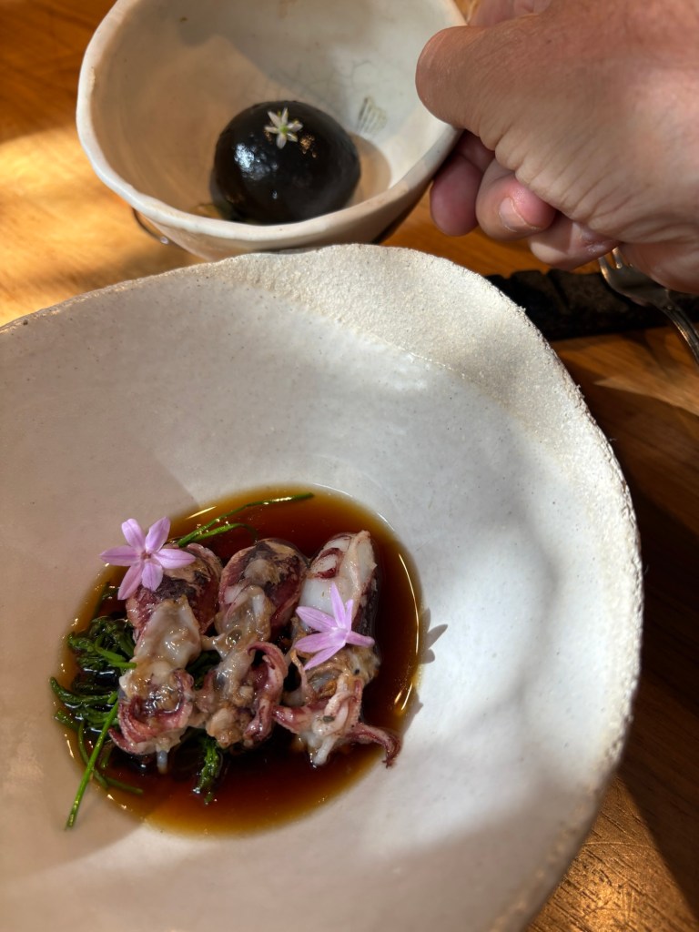 Me ha encantado el punto de los calamares ahumados, tiernos y levemente cocinados, y el añadido de un falso caviar (esferificaciones de kombu).
