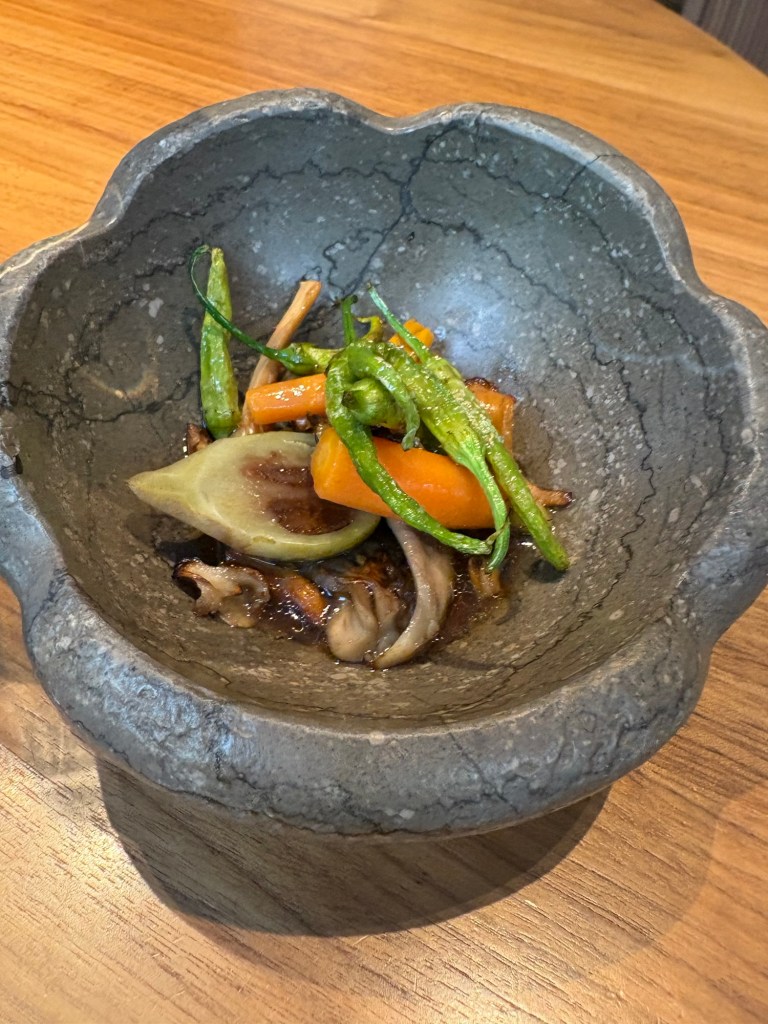 Han decidido sabiamente alternar los habituales pescados enteros para dos con grandes piezas que se trocean. Hoy era un maraviloso mero -quizá mi pescado favorito- de Cádiz de 22 kg. A la brasa y con un pilpil de vino, sidra y su colágeno es un verdadero manjar. Con las mini verduras de su finca, el resultado es perfecto.