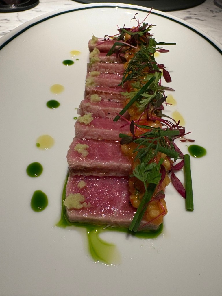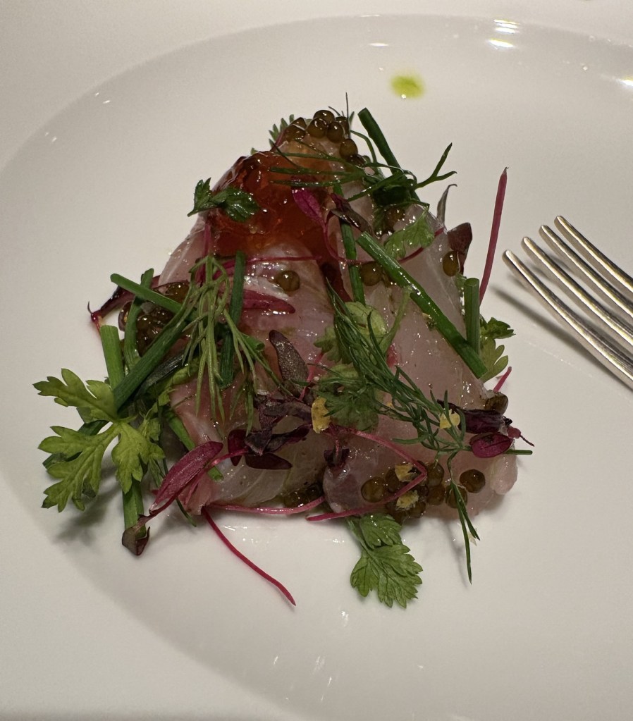 láminas de atún (demasiado gruesas) con aceite de eneldo y hierbas silvestres y un gran tartar de atún con huevo escalfado, mayonesa de soja y jengibre, huevas de trucha y salmón y algo de brioche para empapar.