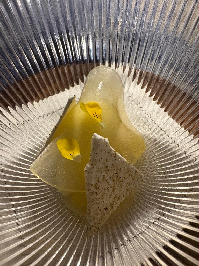 El primer postre es muy cítrico y fresco: varias texturas de piña (con unas maravillosas láminas de gelatina), crujientes de merengue y flores de Sichuan que duermen y excitan la punta de la lengua.
