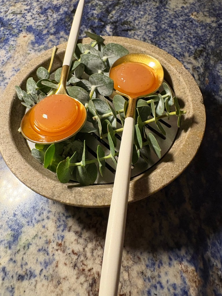 Después la complejidad de un helado de eucalipto mezclado con amarga tierra de cacao, crumble de avellanas, membrillo fresco y en dulce y el golpe de gracia de caramelo salado de eucalipto, en versión líquida. Una gran mezcla que se contrasta con dos cucharas con dos esferificaciones de membrillo y eucalipto.