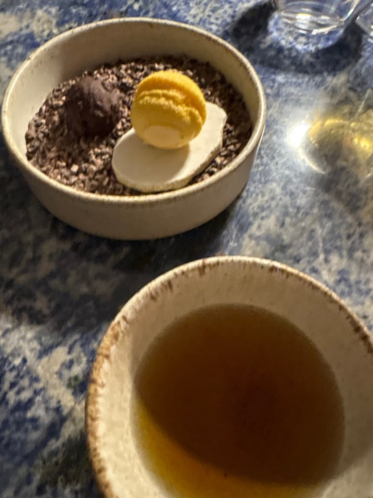 Aún hay dos bocados más: original macarrón de cúrcuma relleno de batata y una gran trufa de chocolate con café servidos con manzanilla, que no sé yo, pero que se puede sustituir por café (mejor).