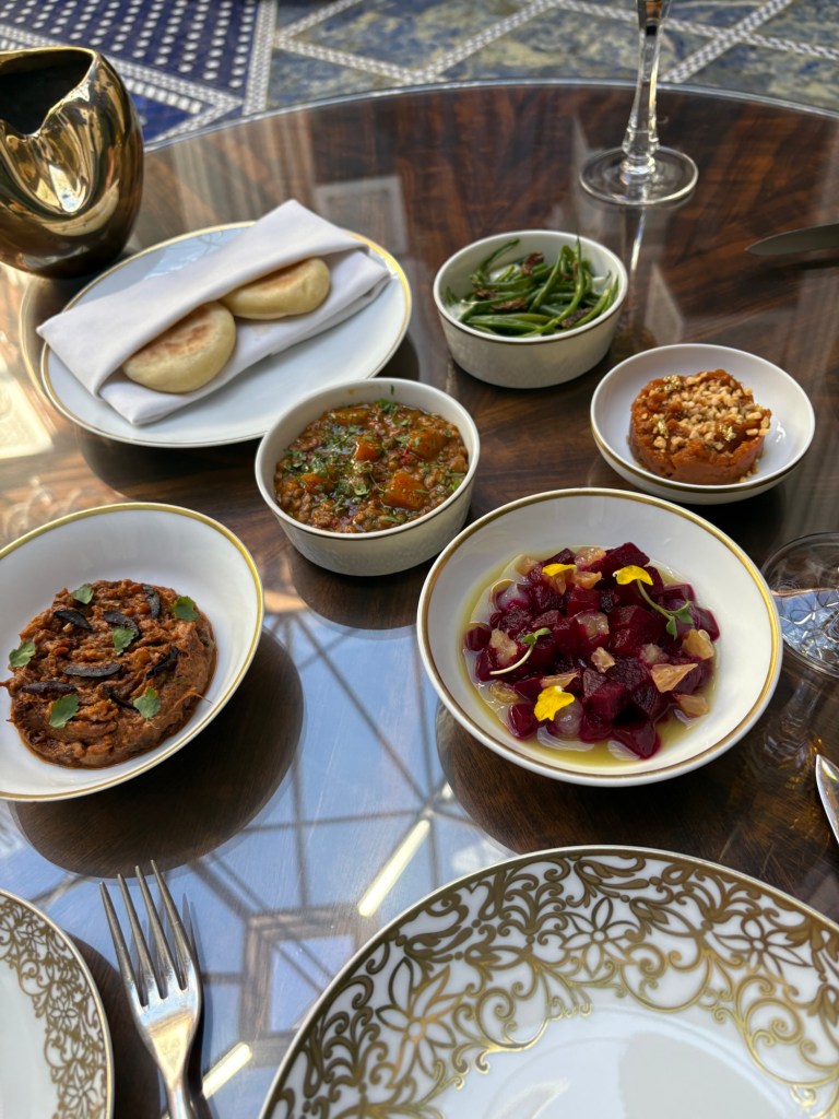 Allí, en un patio añil y blanco, mecidos por el murmullo de una fuente de plata, resguardados por grandes puertas de bronce y bajo mil arabescos, zeliges, girihes y mil motivos más, la comida transcurre plácidamente gracias a un exquisito servicio vestido como en un cuento oriental.