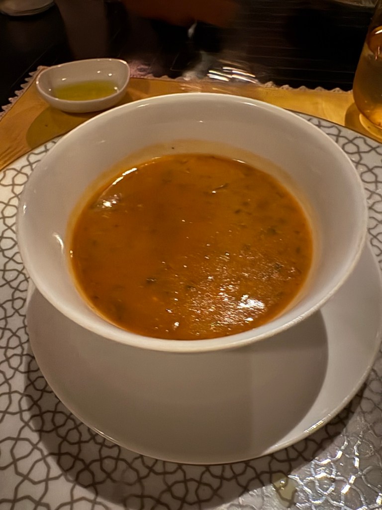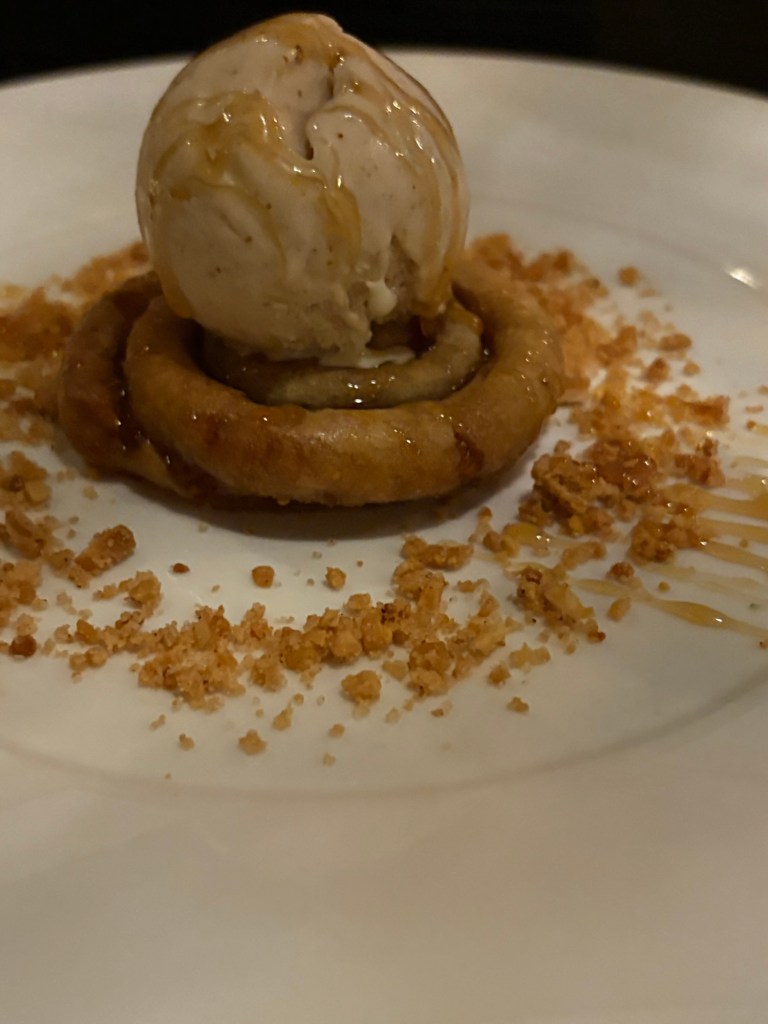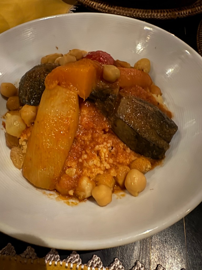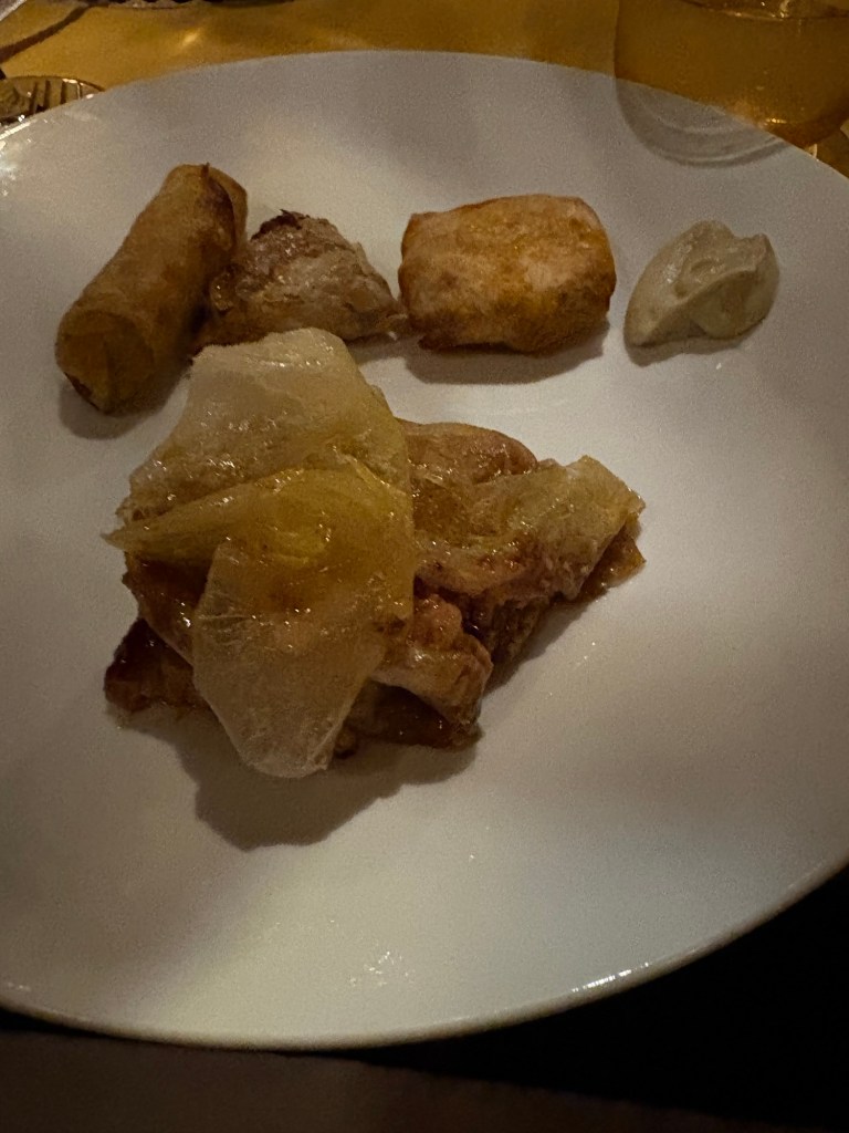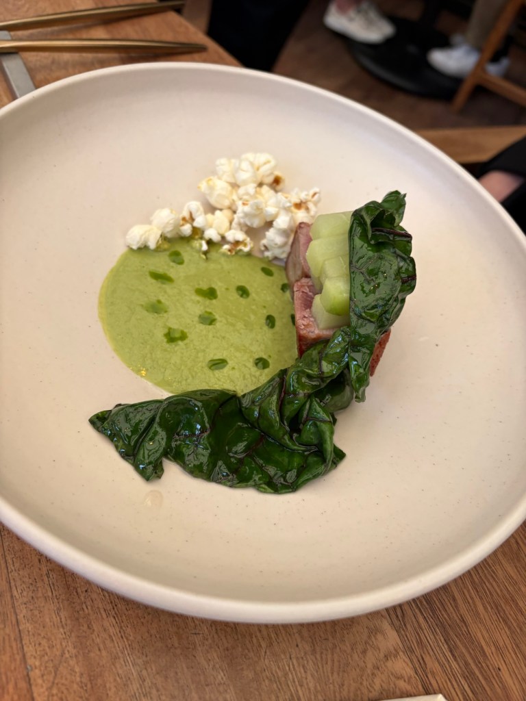 Me ha encantado y aunque empieza con una clementina mezclada con huevas de trucha,una estupenda tarta de arroz con calabaza y crema de especias y el líquido buñuelo de nata ácida con guanciale, no hay que engañarse, porque casi todo es vegetal.