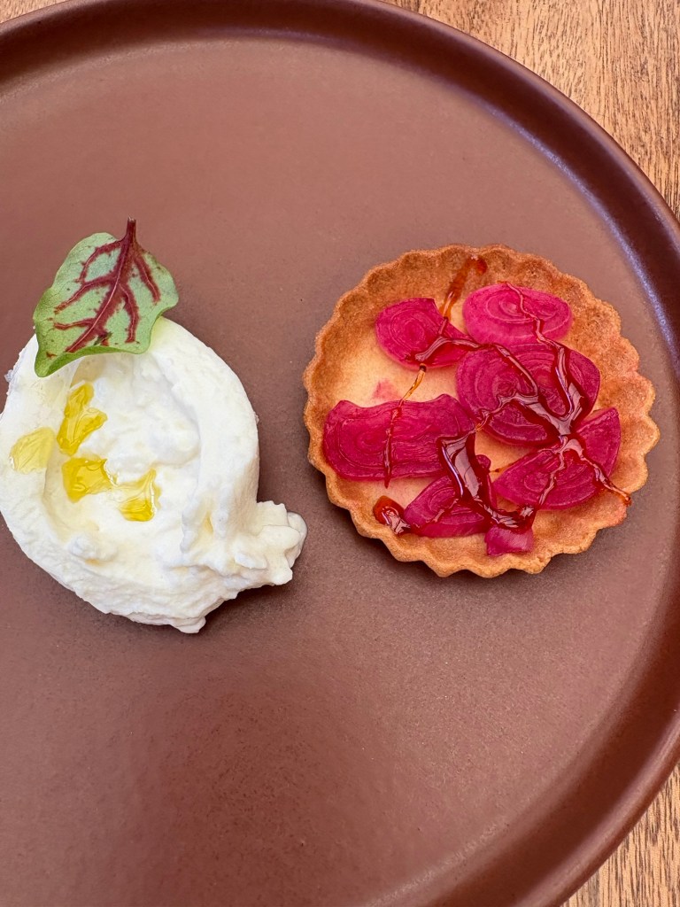La tartaleta de chalotas al vino tinto con un toque de caramelo, se acompaña de una tierna burrata con aceite.