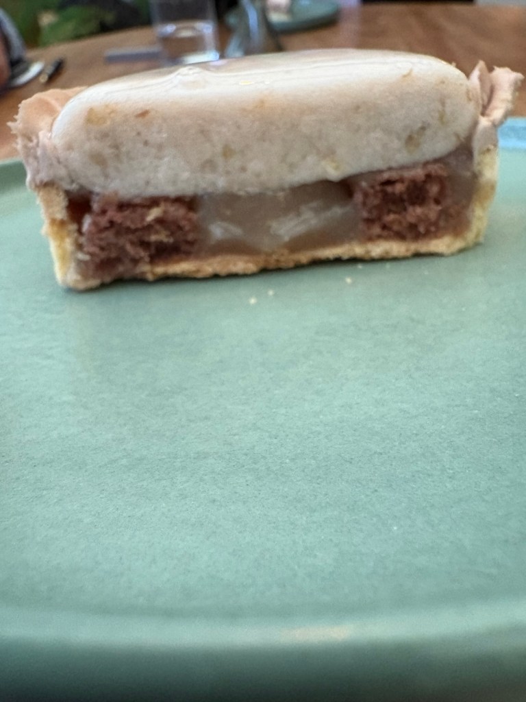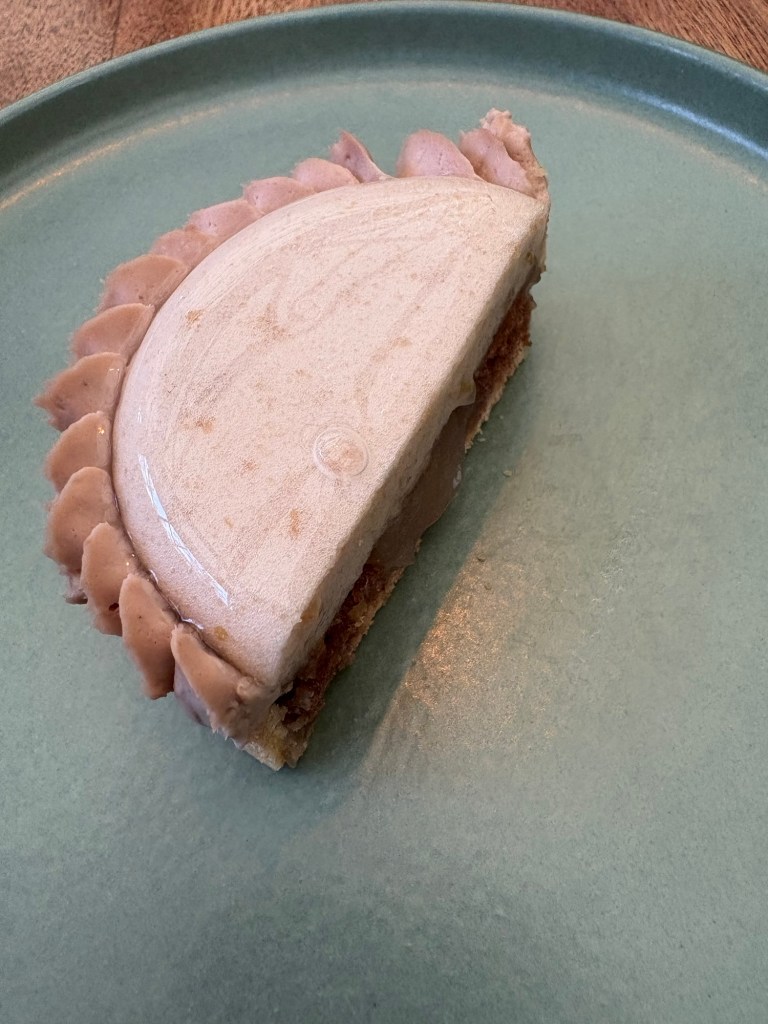 Se acaba con una crujiente y sabrosa tartaleta de pera en texturas con toques de cacao. Solo desmerece mucho visualmente, porque es una pena que se dividan y sirvan solo la mitad. Bastaba con hacer raciones individuales más pequeñas.