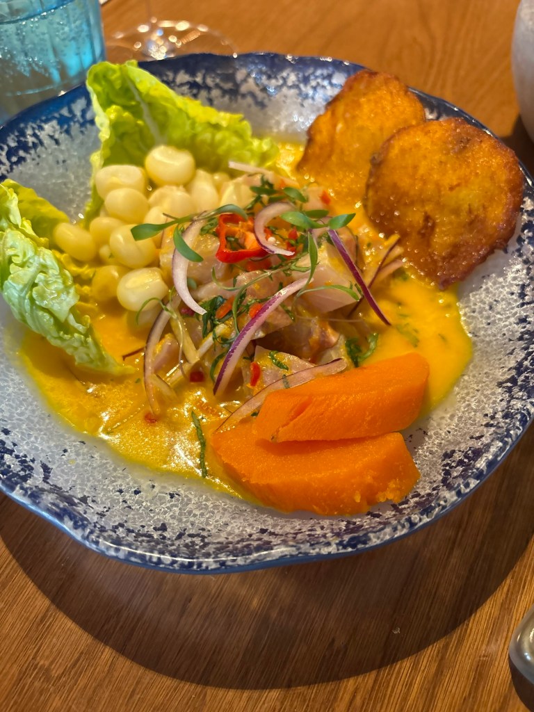 Lo que hay que pedir siempre es uno de los estupendos ceviches. Hoy, como casi siempre, nos hemos decidido por el criollo, una estupenda combinación de medregal con una punzante leche de tigre, con ají amarillo, tortitas de maíz, choclo (el maíz tierno, recién formado, antes de secarse) y boniato.