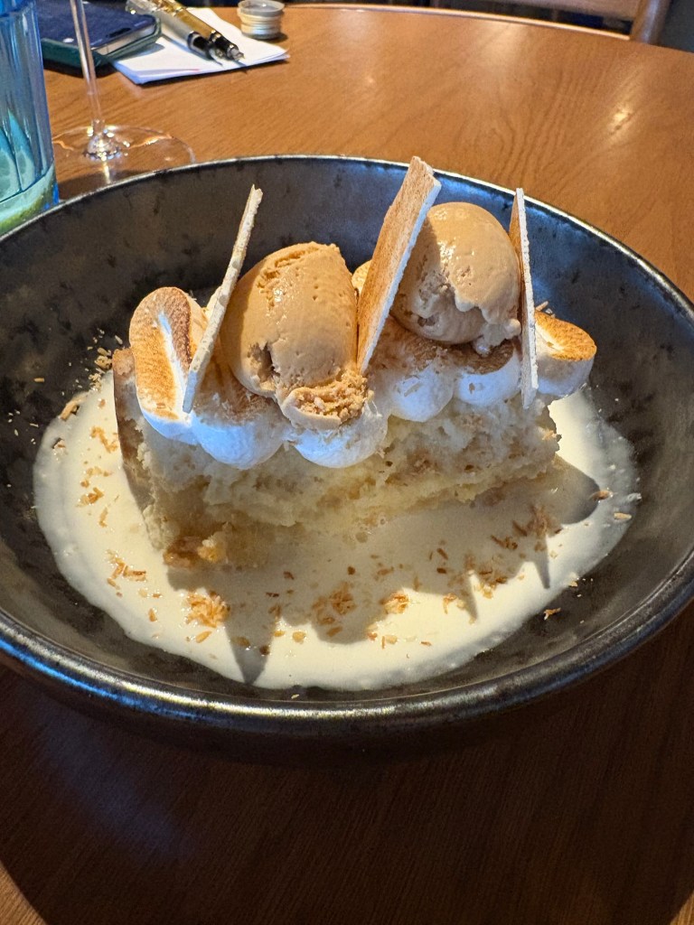 Hay postres muy ricos y muy dulces en la cocina peruana, todos con nombres tan bellos como picarones o suspiros limeños, pero en La Mar me encanta el pastel de tres leches, con un fuerte sabor a coco.
