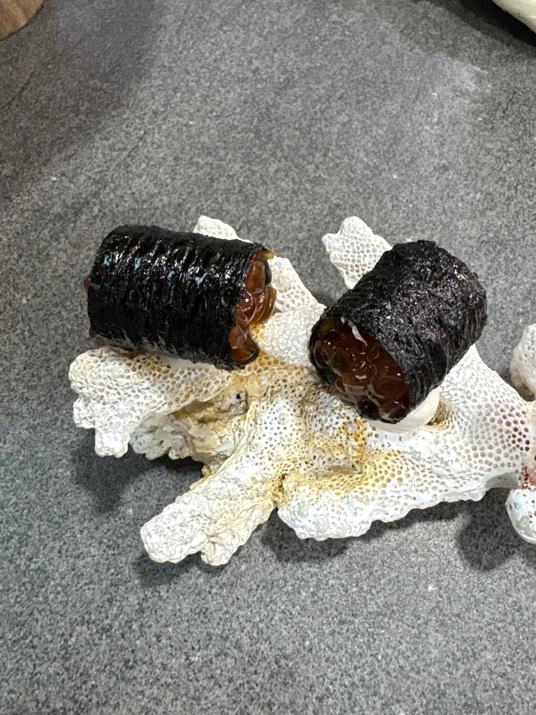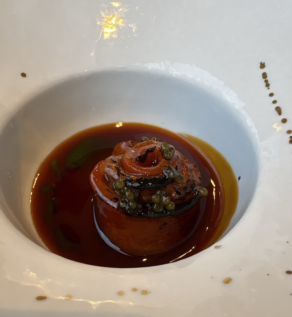 En la cocina, entre algas y humo de hielo seco, itxasotik (productos del mar): guiso de chipirón, un crujiente rollito de algas con mantequilla de plancton y huevas de salmón de mucho sabor a mar, tartar de gamba de Huelva que acentúa su dulzor con pilpil de coliflor y un delicioso y refrescante txacoli infusionado con algas y espuma es espirulina.